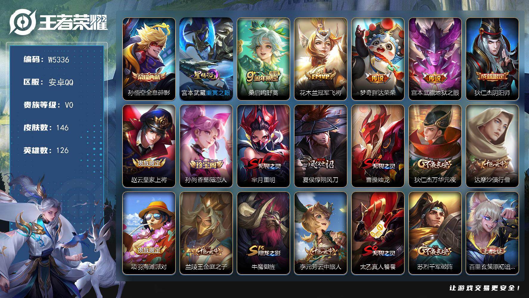 【W5336】安卓QQ-有二次-贵5-126英雄-146皮肤-1典藏-4传说-