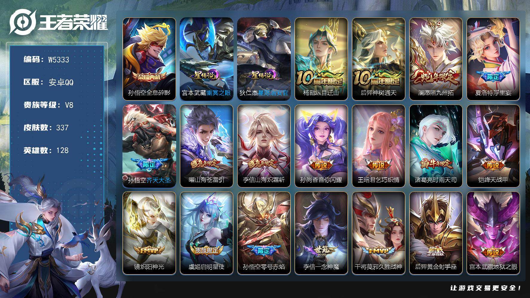 【W5333】财神纳福天幕-安卓Q区-无二次-贵8-128英雄-337皮肤-1