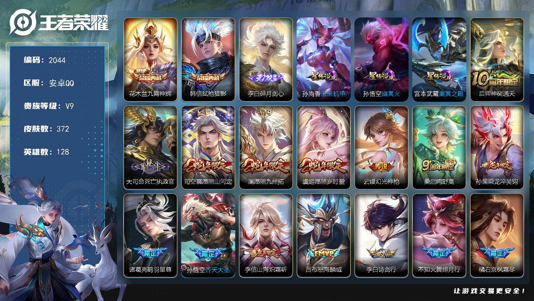 安卓Q-V9-尊贵铂金I段位-128英雄-372皮肤-2典藏皮肤-1无双-29