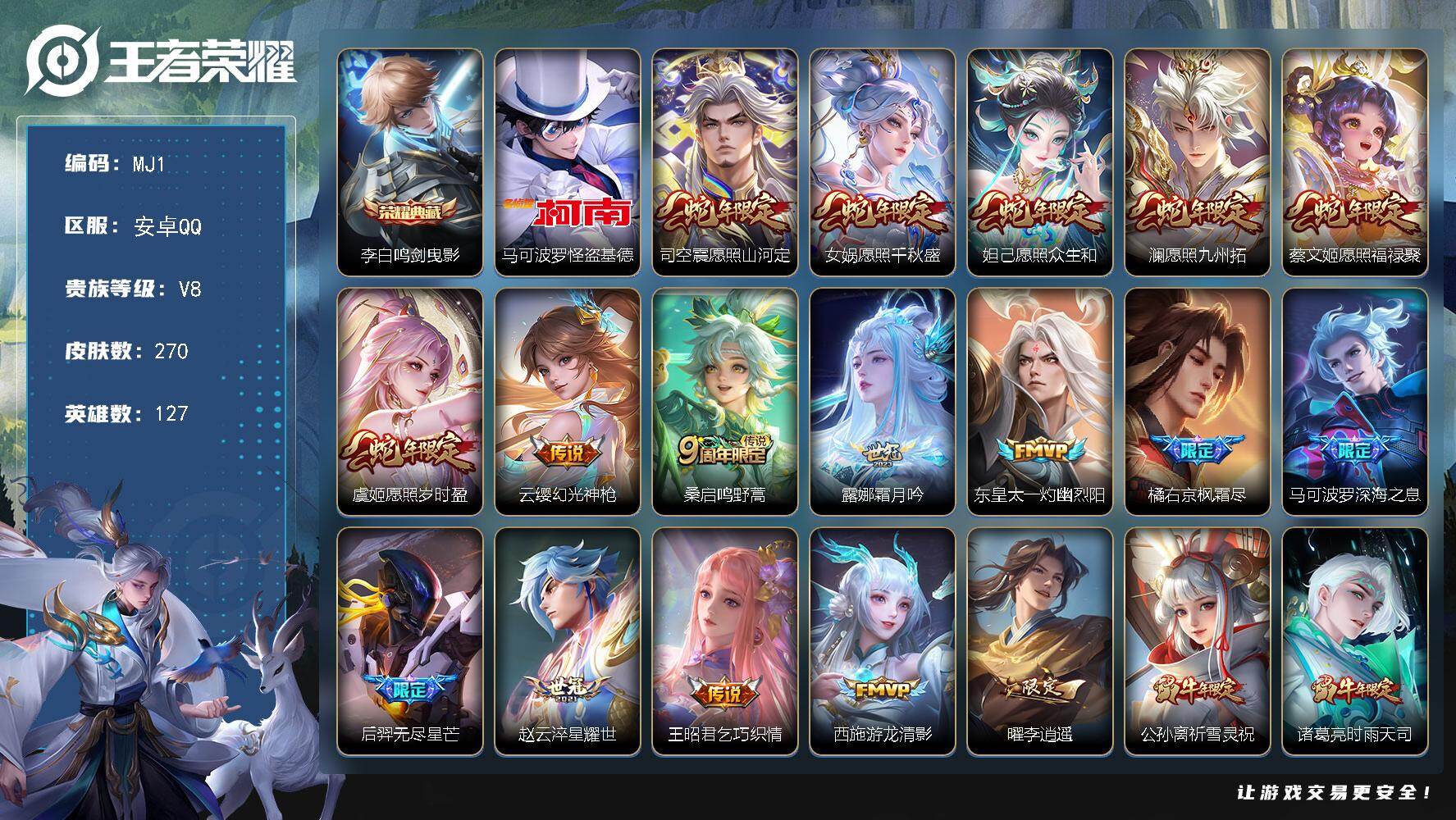 安卓Q-V8-永恒钻石II段位-127英雄-270皮肤-1典藏皮肤-1珍品传说