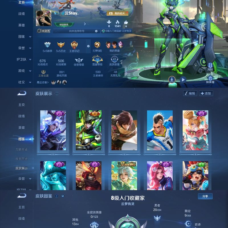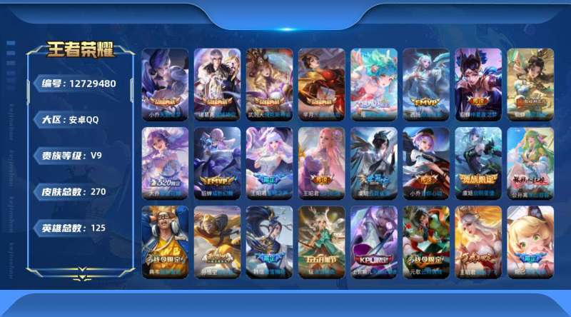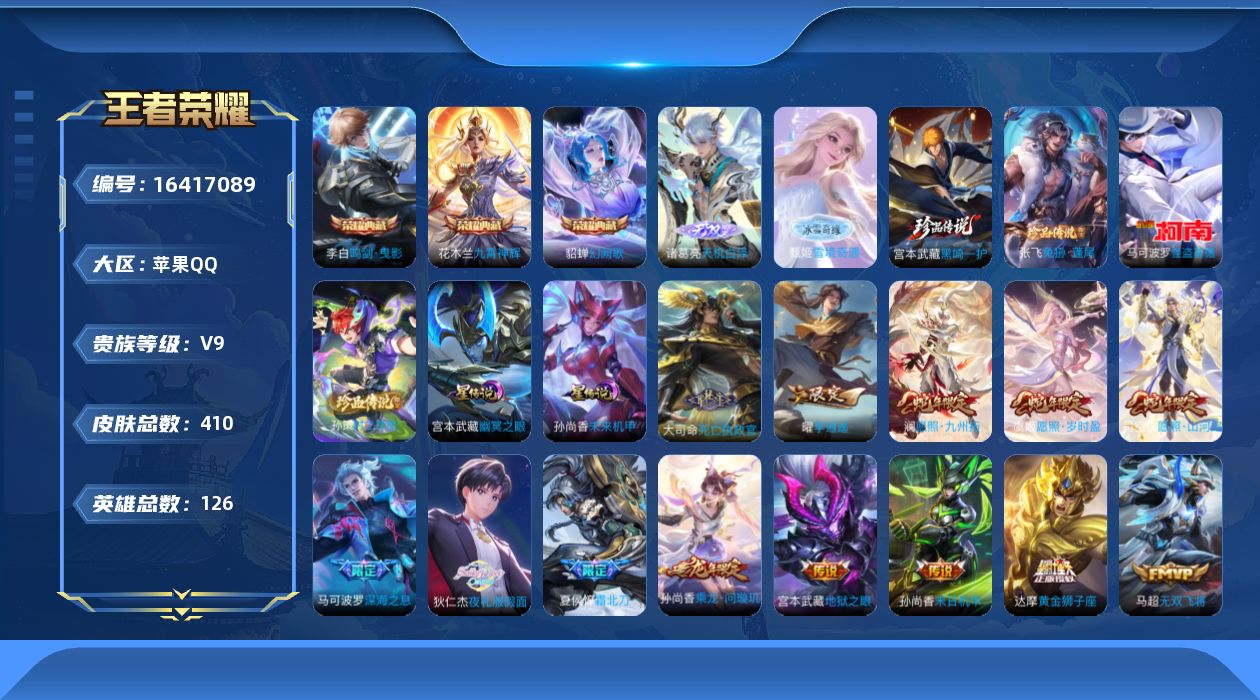 V9-最强王者段位-126英雄-410皮肤-3典藏皮肤-2无双-4珍品传说-3星传说-33传说-119史诗