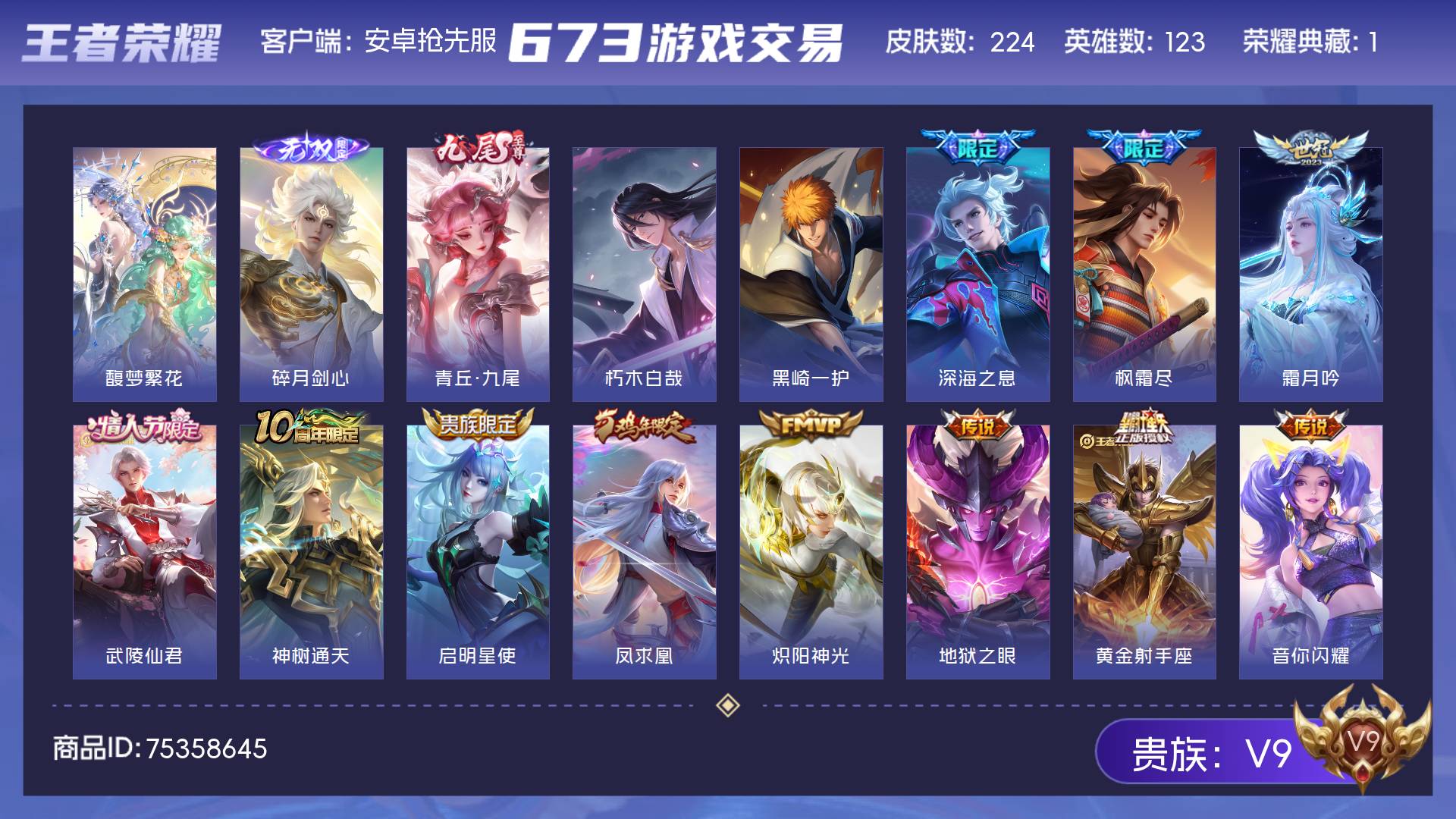 V9 皮肤224 英雄123 至尊星耀 荣耀典藏1 珍品无双1 无双皮肤2 珍品传说2 传说18 其他皮肤207