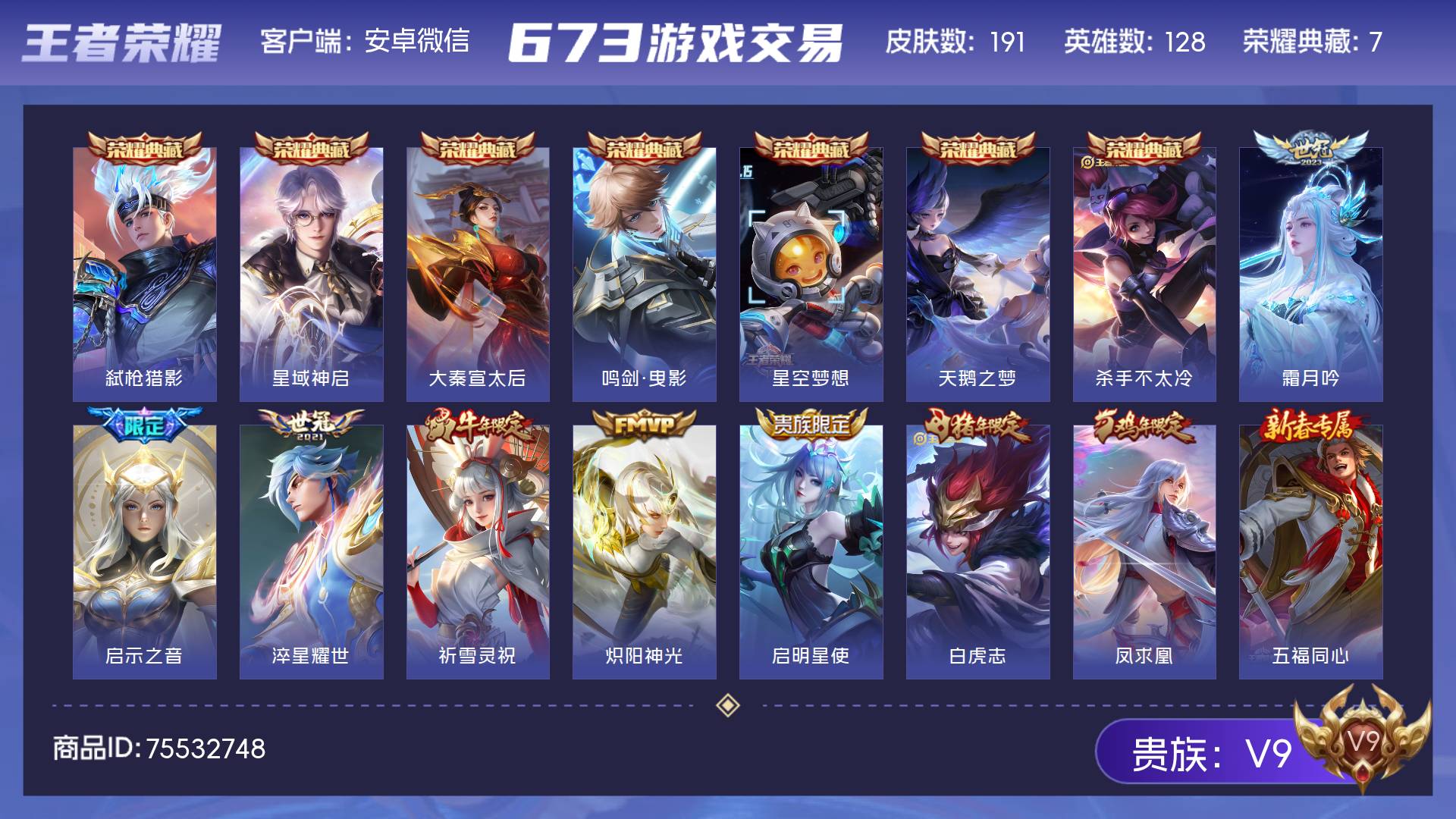 V9 皮肤191 英雄128 至尊星耀 荣耀典藏7 星传说22 传说8 其他皮肤181