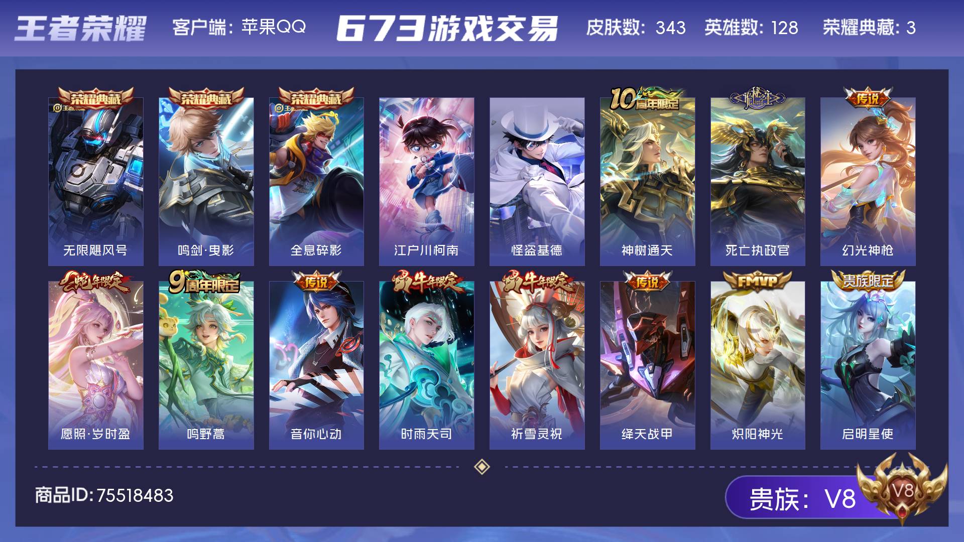 V8 皮肤343 英雄128 永恒钻石 荣耀典藏3 珍品传说2 传说18 其他皮肤324