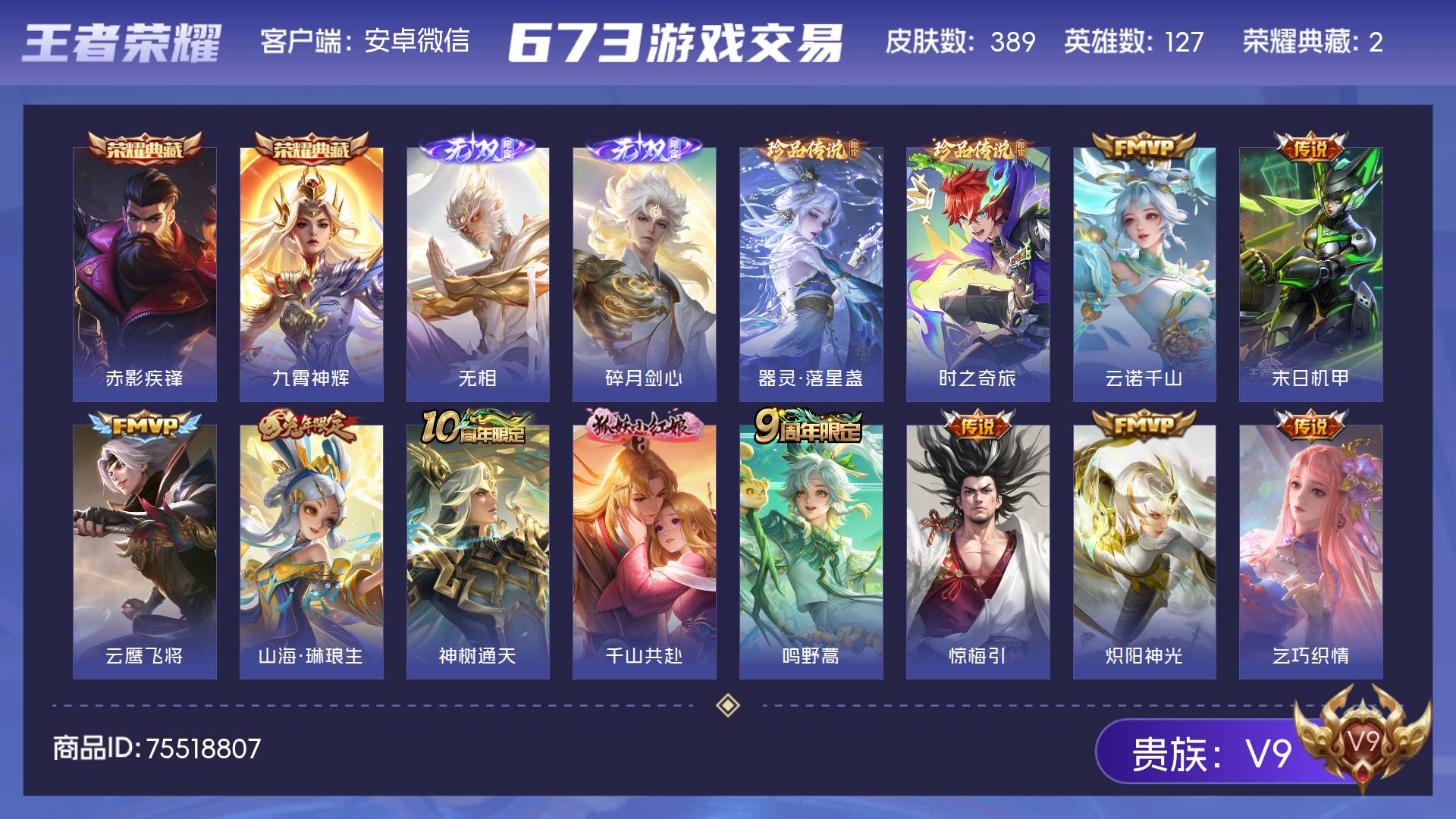 V9 皮肤389 英雄127 无双王者 荣耀典藏2 无双皮肤2 珍品传说2 传说32 其他皮肤356