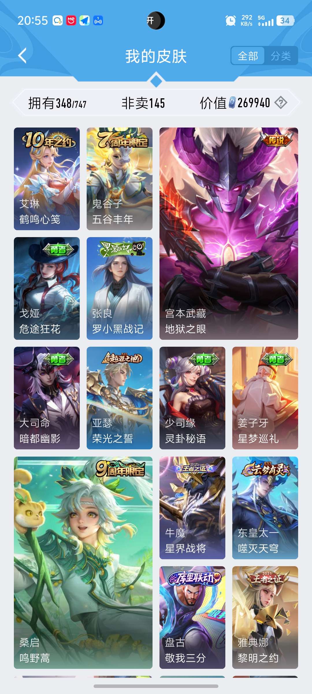 203皮肤 1典藏 2星传说 9传说 65限定 5印记! 【英雄全皮】:空空儿