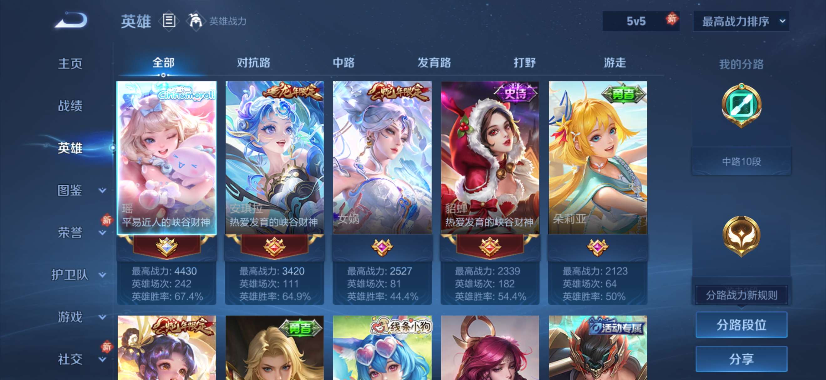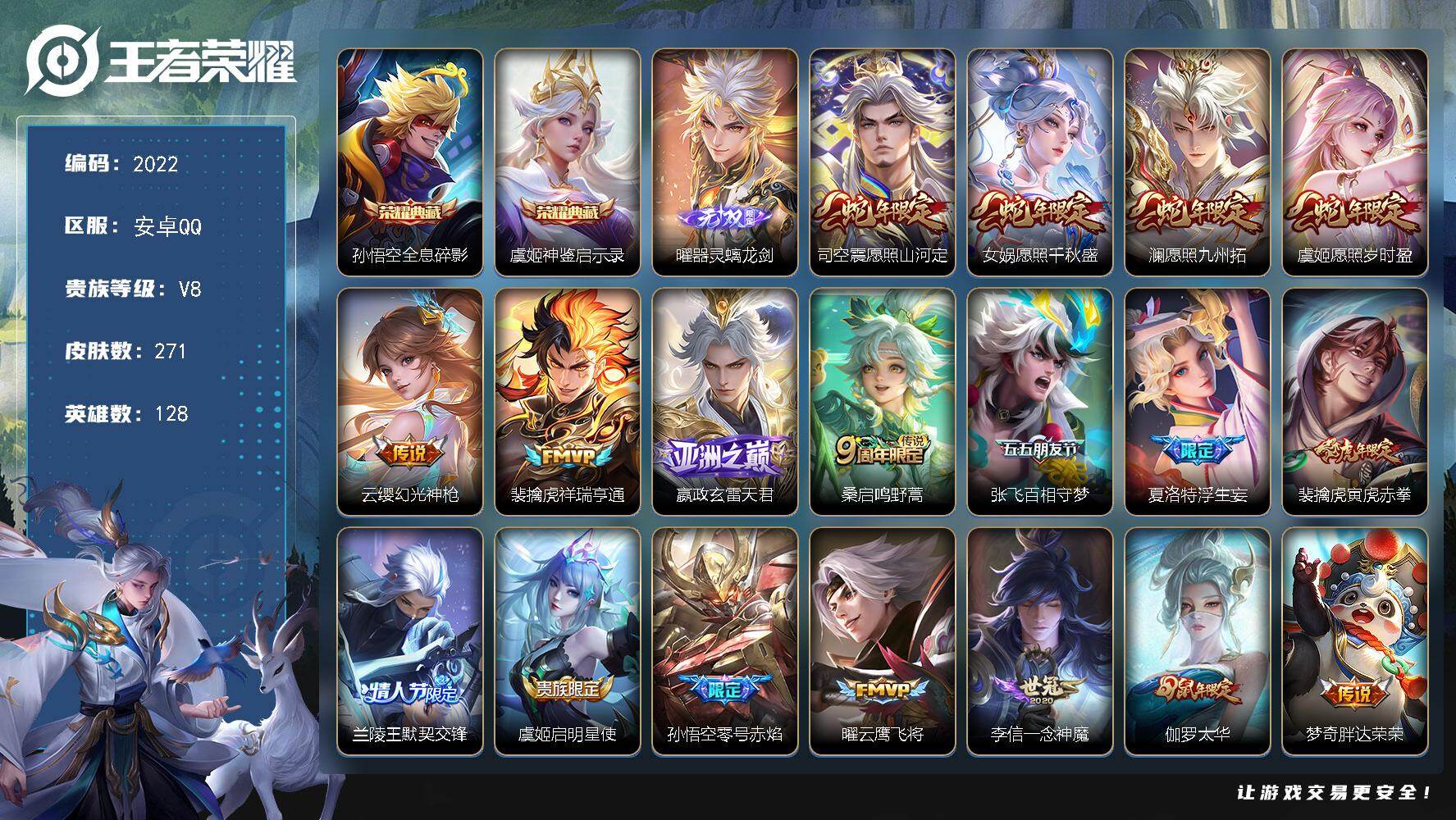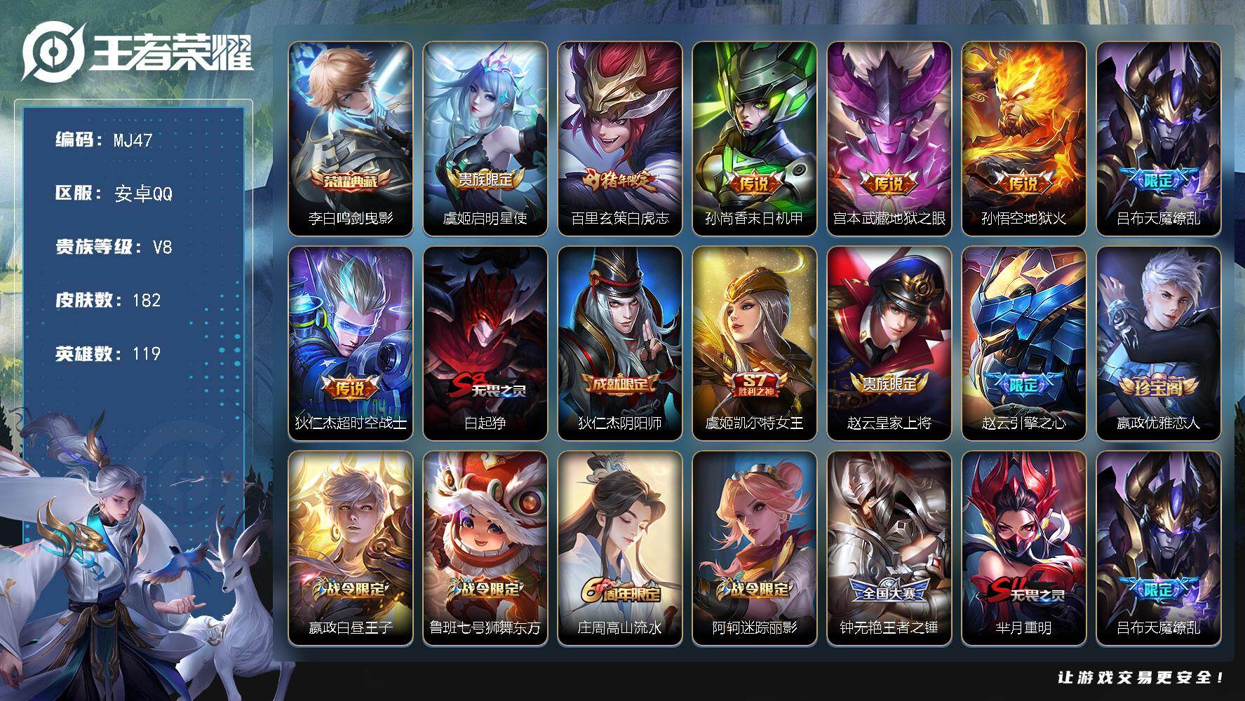 安卓Q-V8-至尊星耀IV段位-119英雄-182皮肤-1典藏皮肤-7传说-5