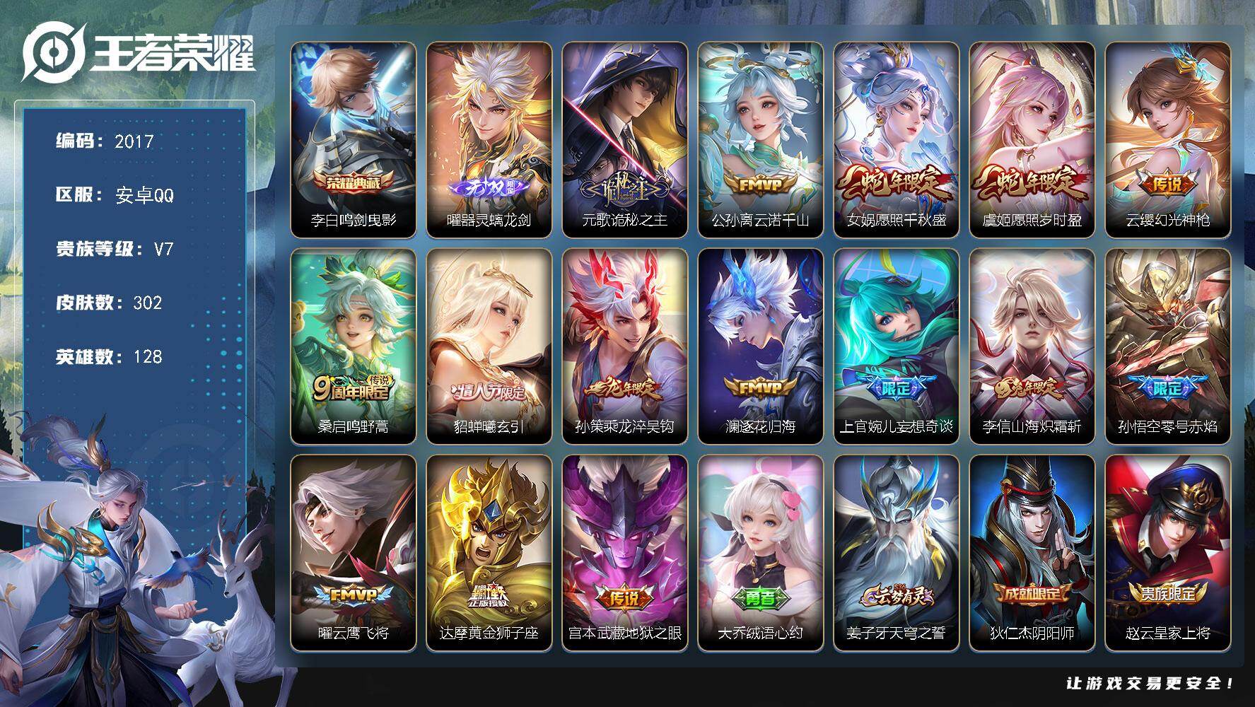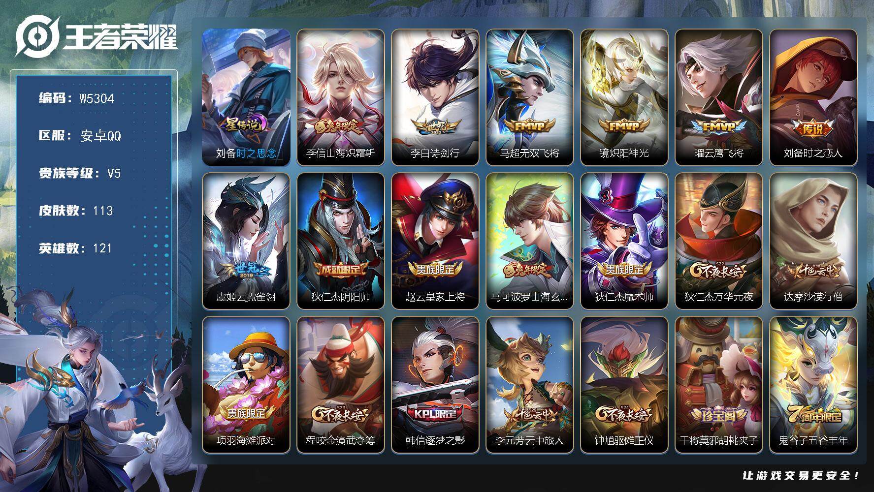 【W5304】安卓Q区-可二次-贵7-122英雄-113皮肤-7传说-29史诗