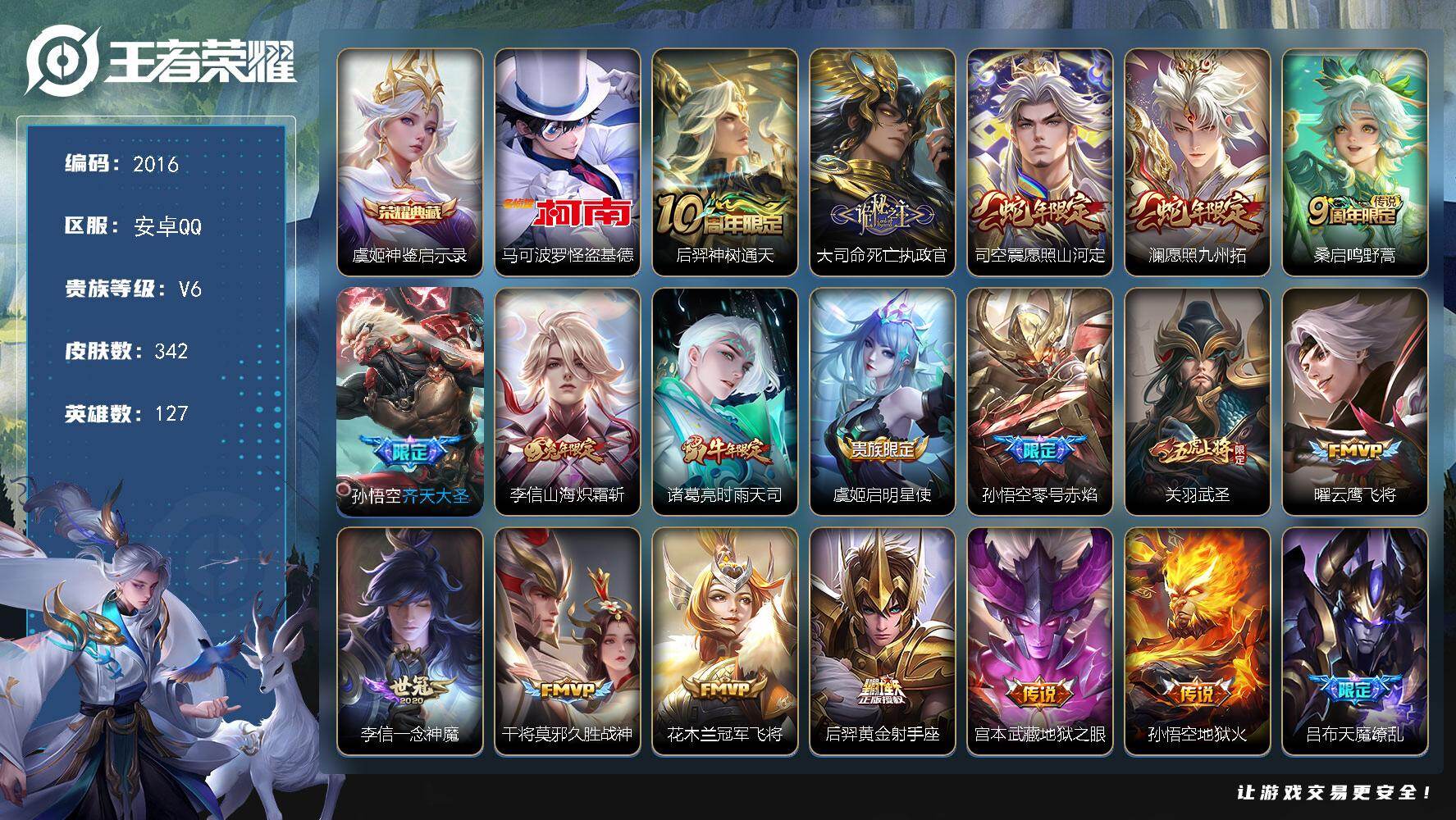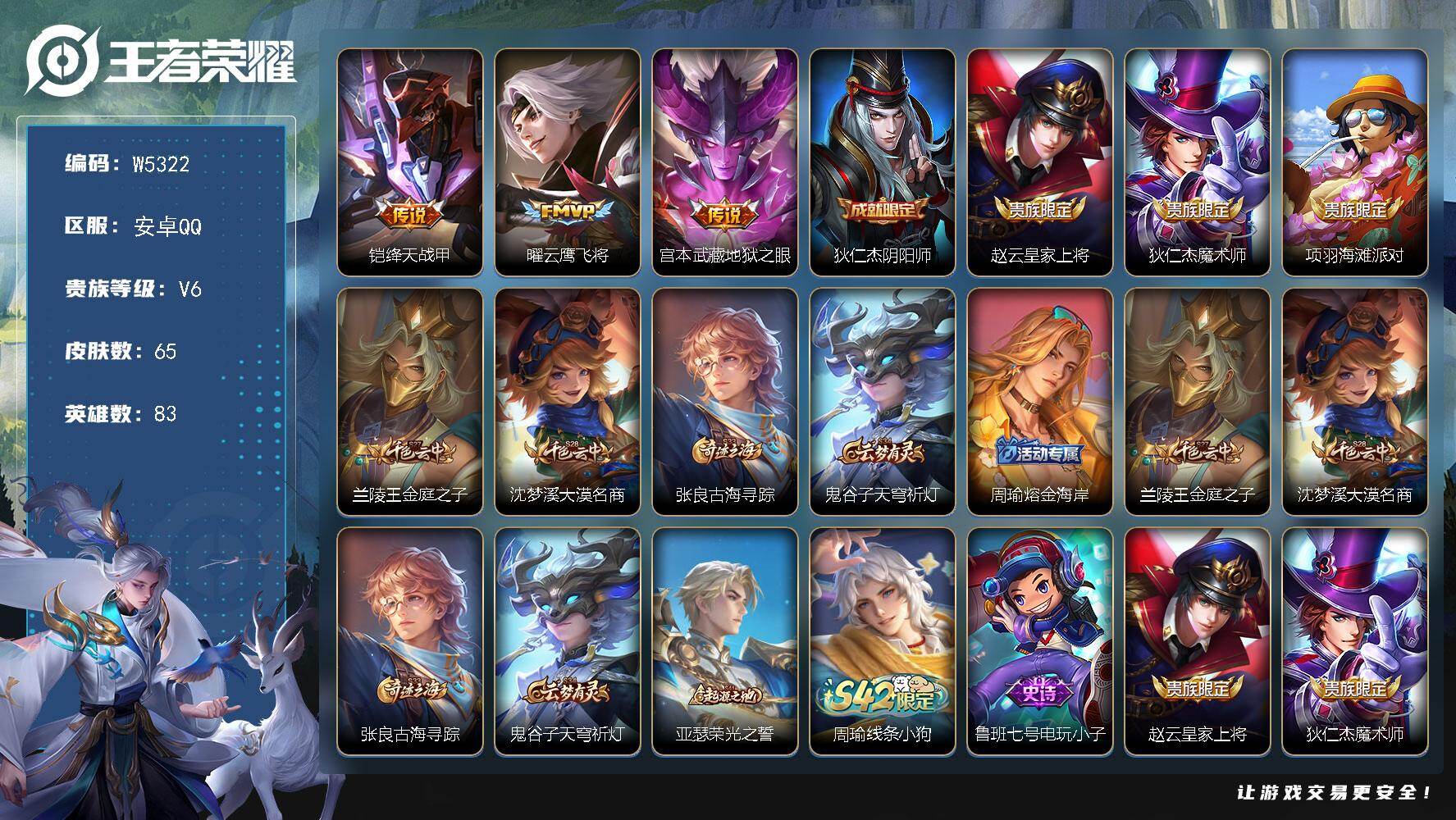 【W5322】安卓QQ-有二次-贵6-83英雄-65皮肤-3传说-13限定-1