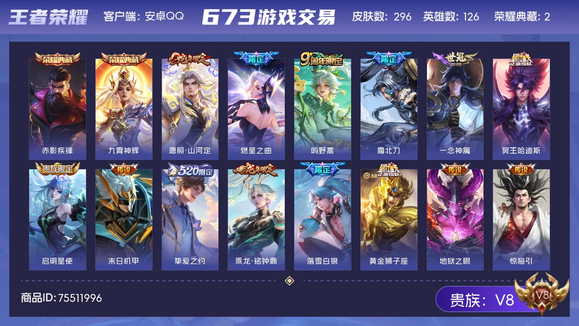 V8 皮肤296 英雄126 至尊星耀 荣耀典藏2 传说19 其他皮肤280