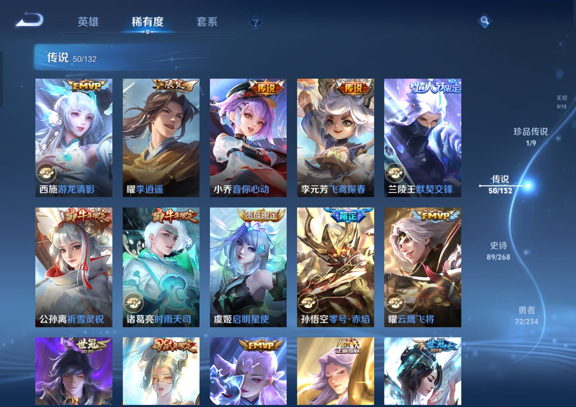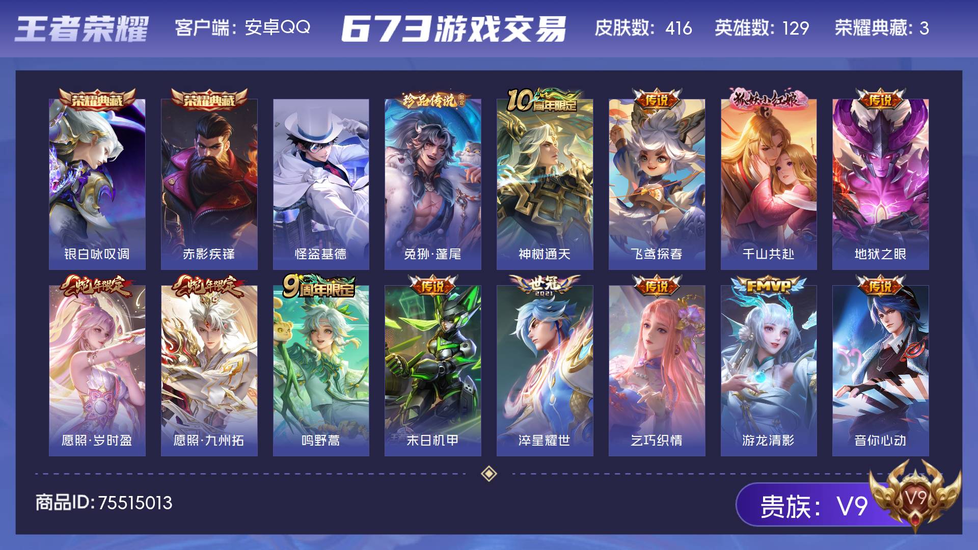 V9 皮肤416 英雄129 最强王者 荣耀典藏3 珍品传说2 星传说4 传说27 其他皮肤388