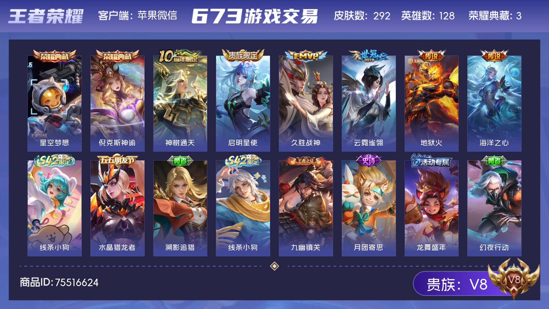 V8 皮肤292 英雄128 至尊星耀 荣耀典藏3 传说6 其他皮肤289
