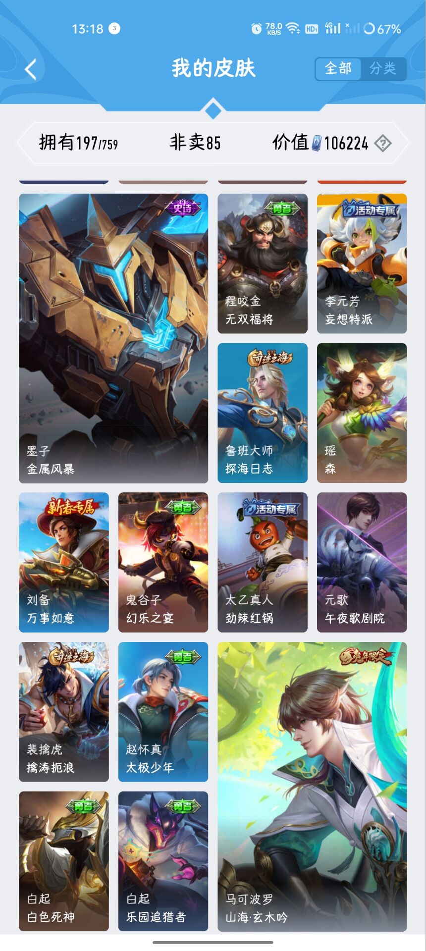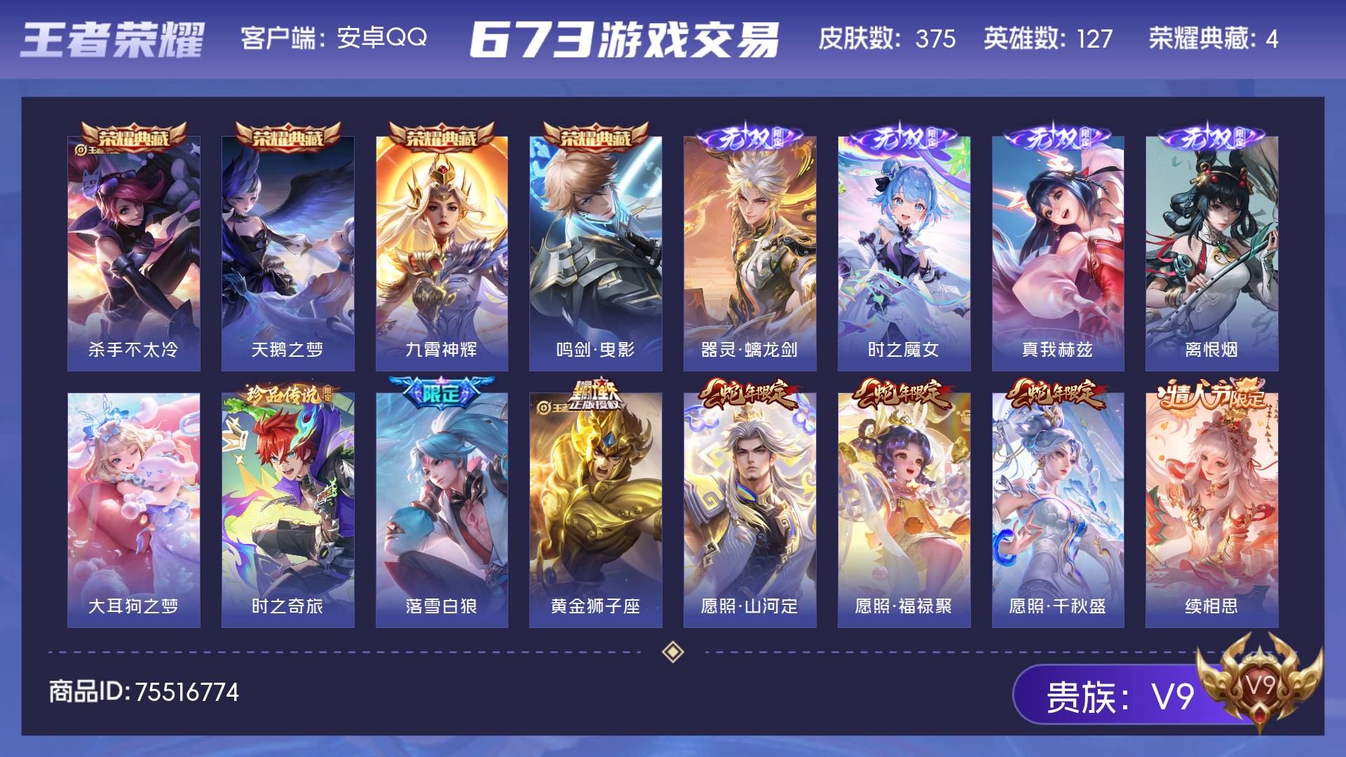 V9 皮肤375 英雄127 至尊星耀 荣耀典藏4 无双皮肤4 珍品传说2 传说35 其他皮肤334