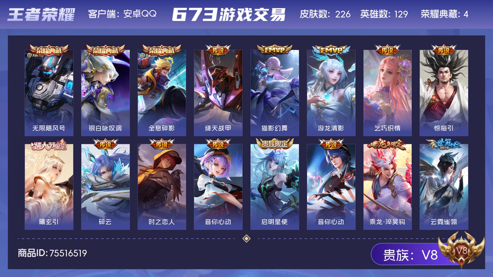 V8 皮肤226 英雄129 永恒钻石 荣耀典藏4 星传说1 传说19 其他皮肤210