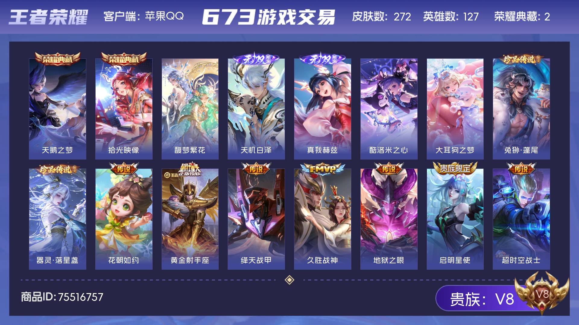 V8 皮肤272 英雄127 至尊星耀 荣耀典藏2 珍品无双1 无双皮肤2 珍品传说4 传说17 其他皮肤252
