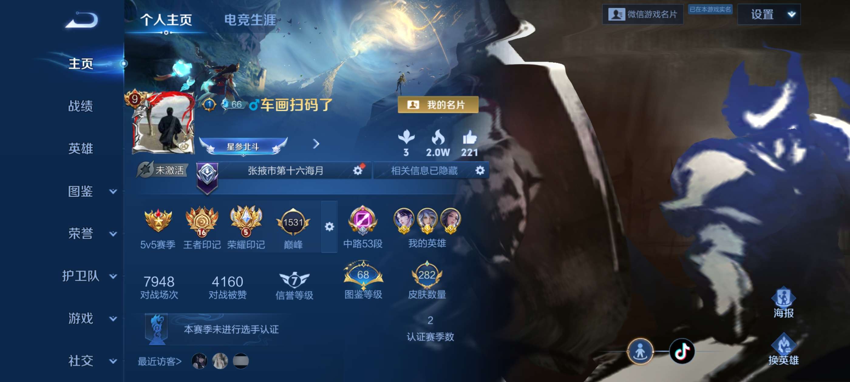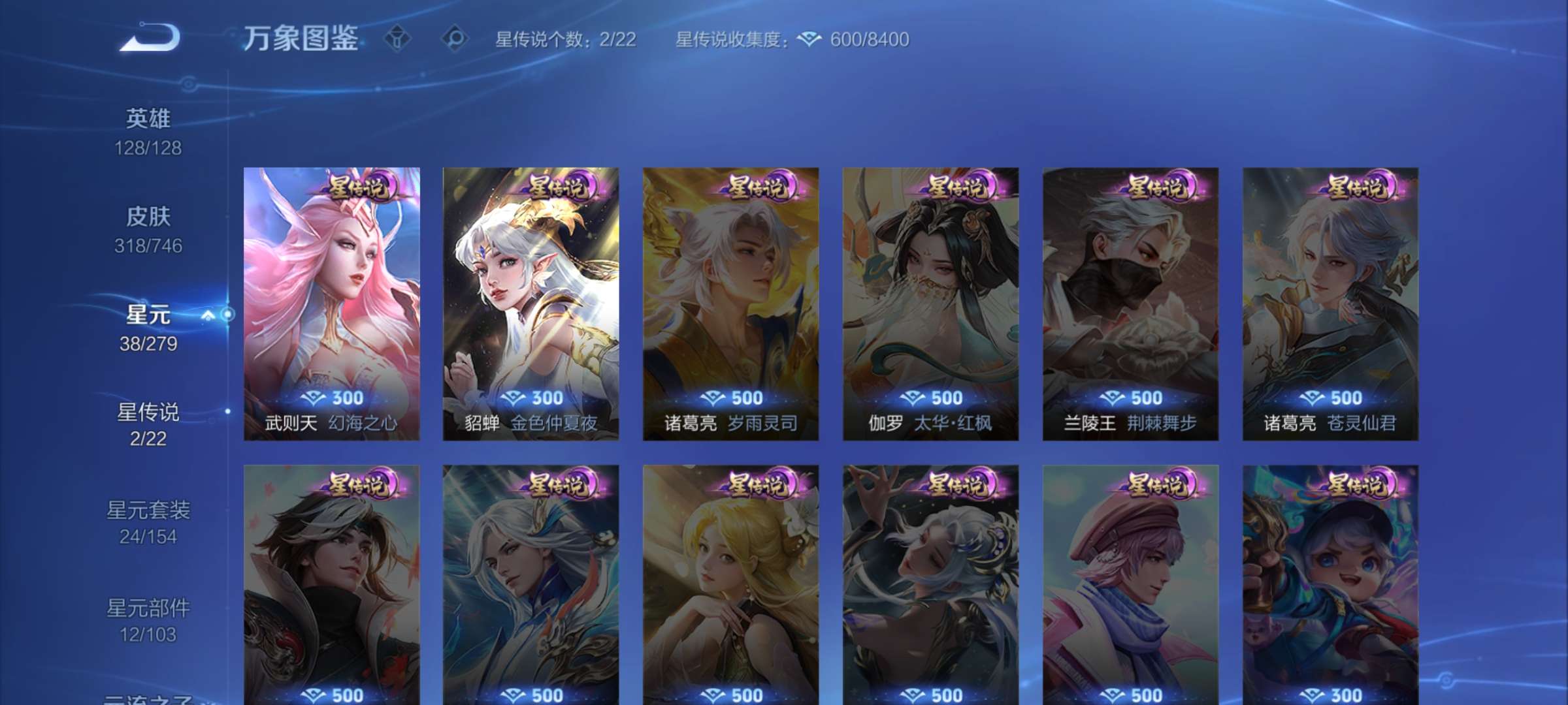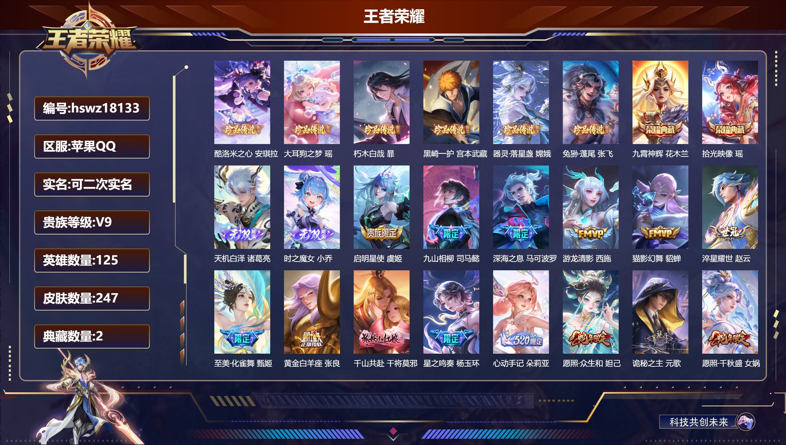 苹果QQ/荣耀王者/247皮肤/125英雄/2典藏/1珍品无双/2无双/6珍品传说/17传说/80史