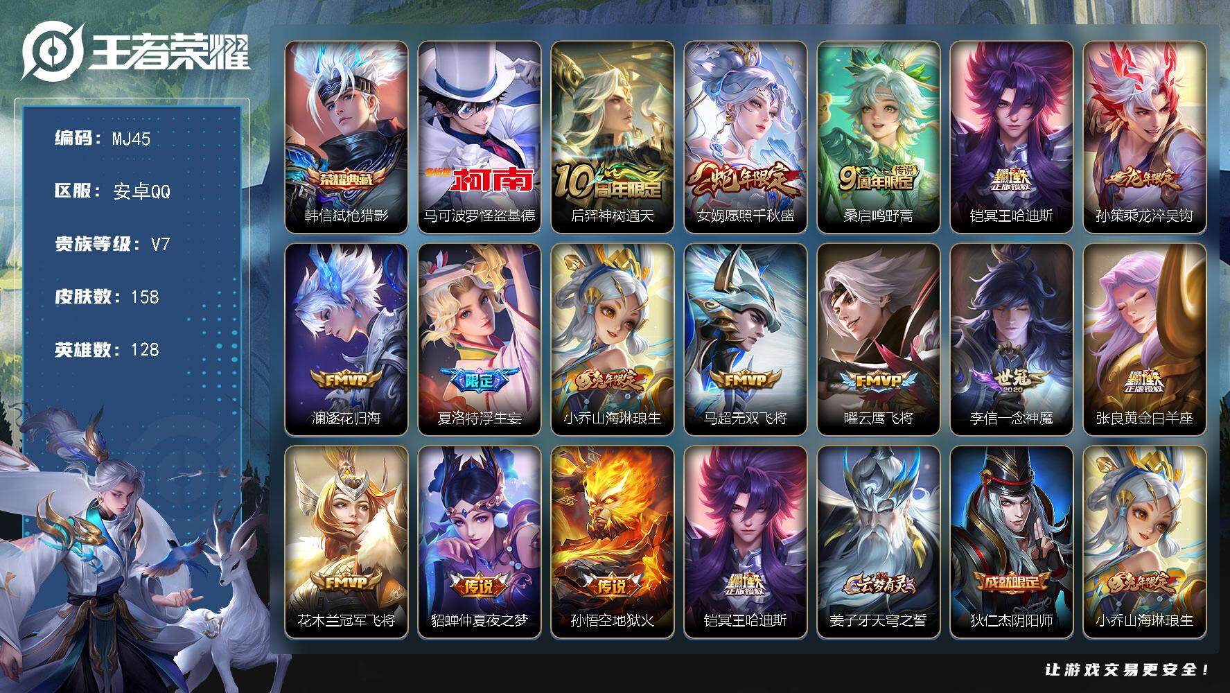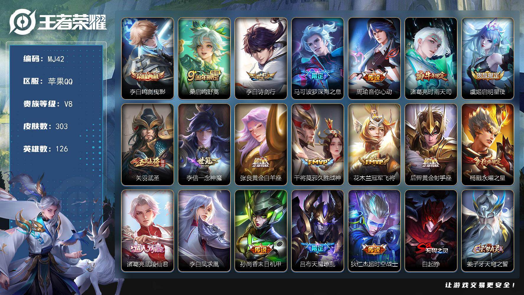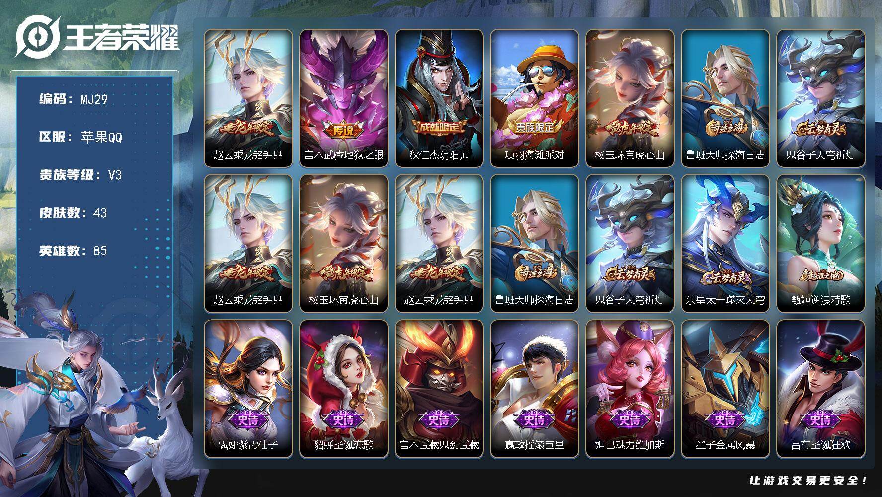 苹果Q-V3-至尊星耀V段位-85英雄-43皮肤-2传说-13史诗【传说皮肤