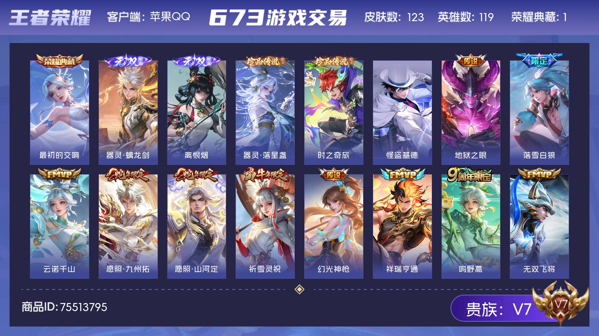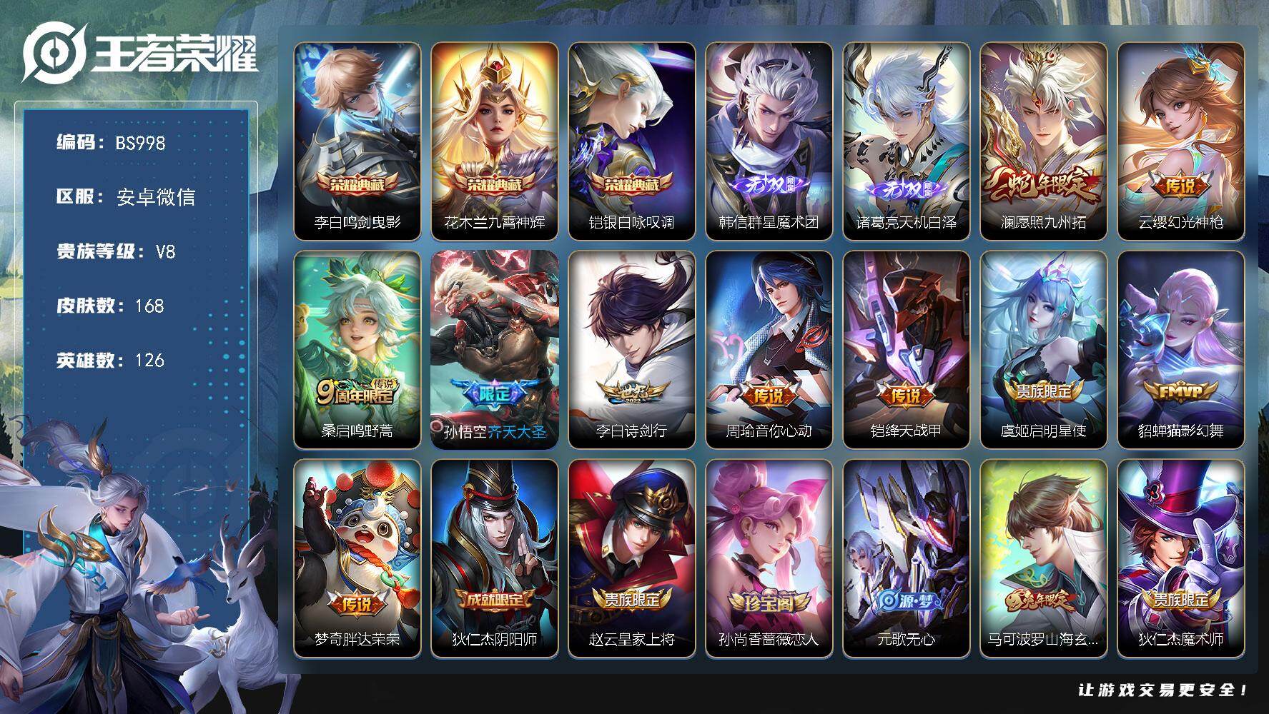 9年老号-安卓微信-无二次-贵7-114英雄-120皮肤-1典藏-13传说-34限定-27史诗