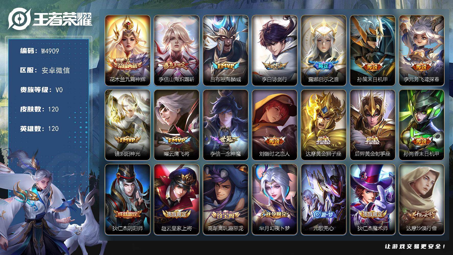 【W4909】9年老号-安卓微信-无二次-贵7-114英雄-120皮肤-1典藏