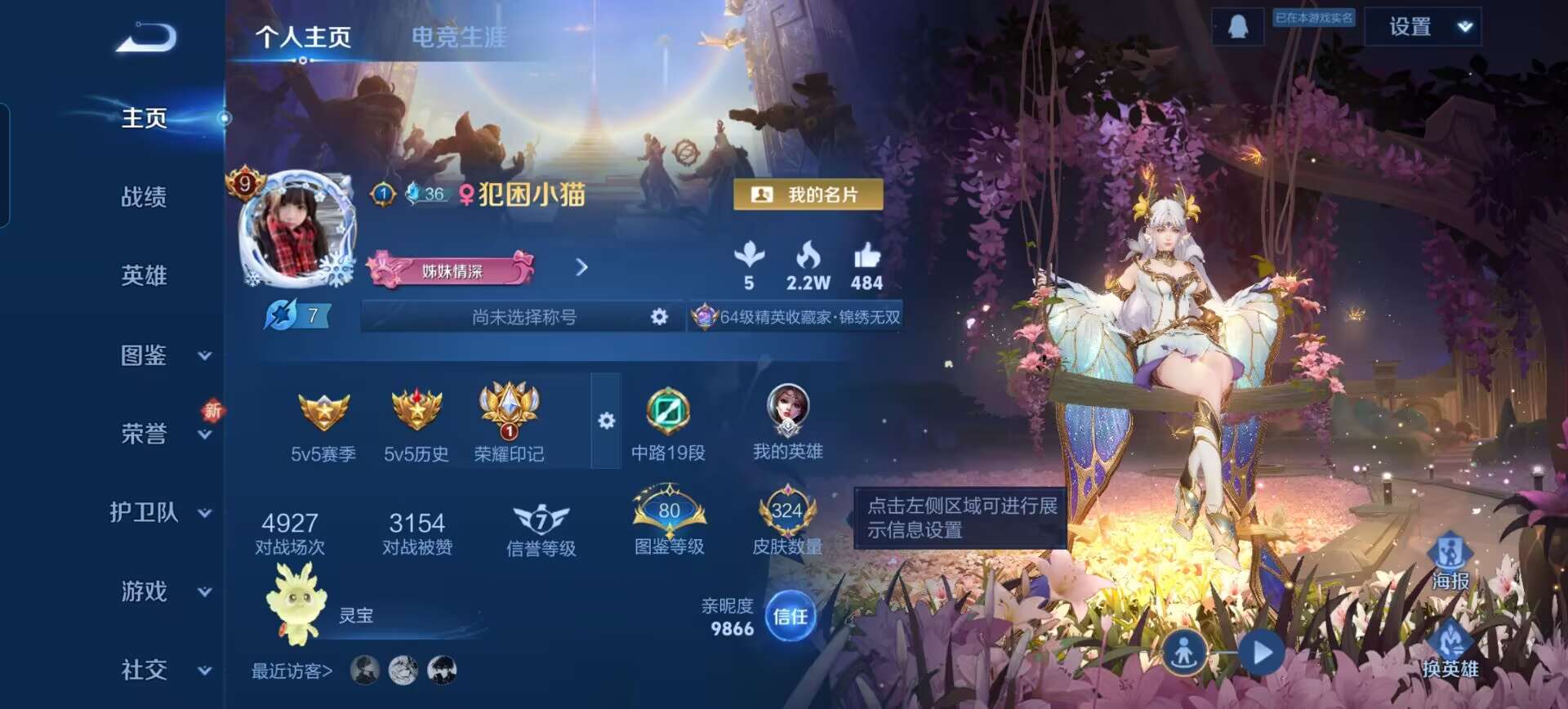 【贵族2 荣耀典藏0 无双0 传说皮肤4 史诗皮肤24 皮肤数量104】当前段位:钻石5贵族积分:300 热门皮肤:黄金狮子座 超时空战士 神树通天 涂山容容 青蛇 晚萤 星夜王子 水晶猎龙者 心灵骇客