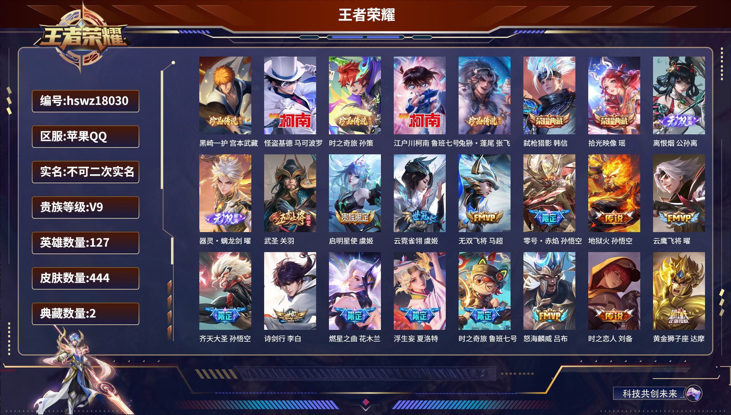 苹果QQ/至圣王者/444皮肤/127英雄/2典藏/0珍品无双/2无双/5珍品传说/38传说/131