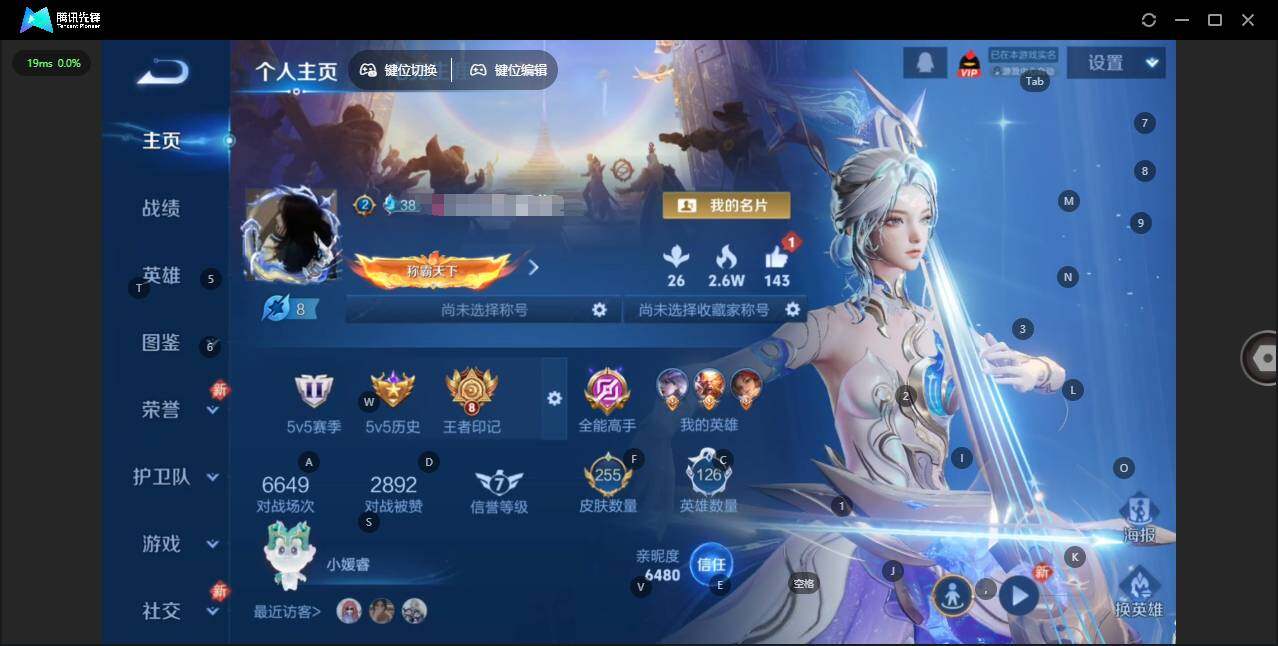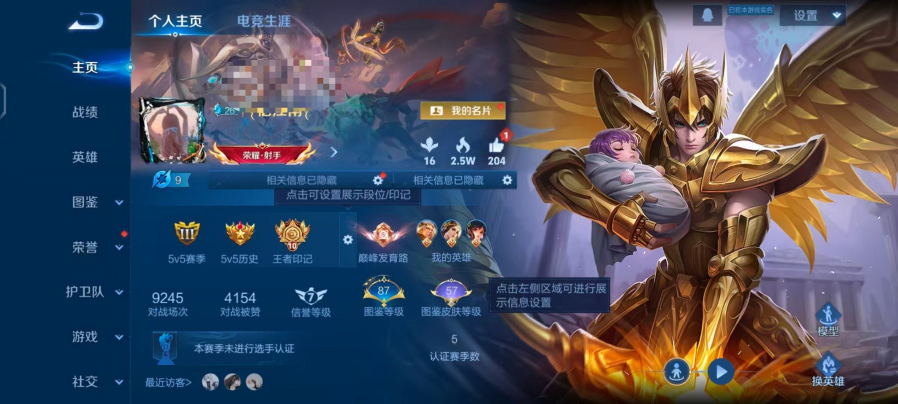 实名: 可修改 贵族等级: V6 英雄数: 124 皮肤数: 147 荣耀水晶