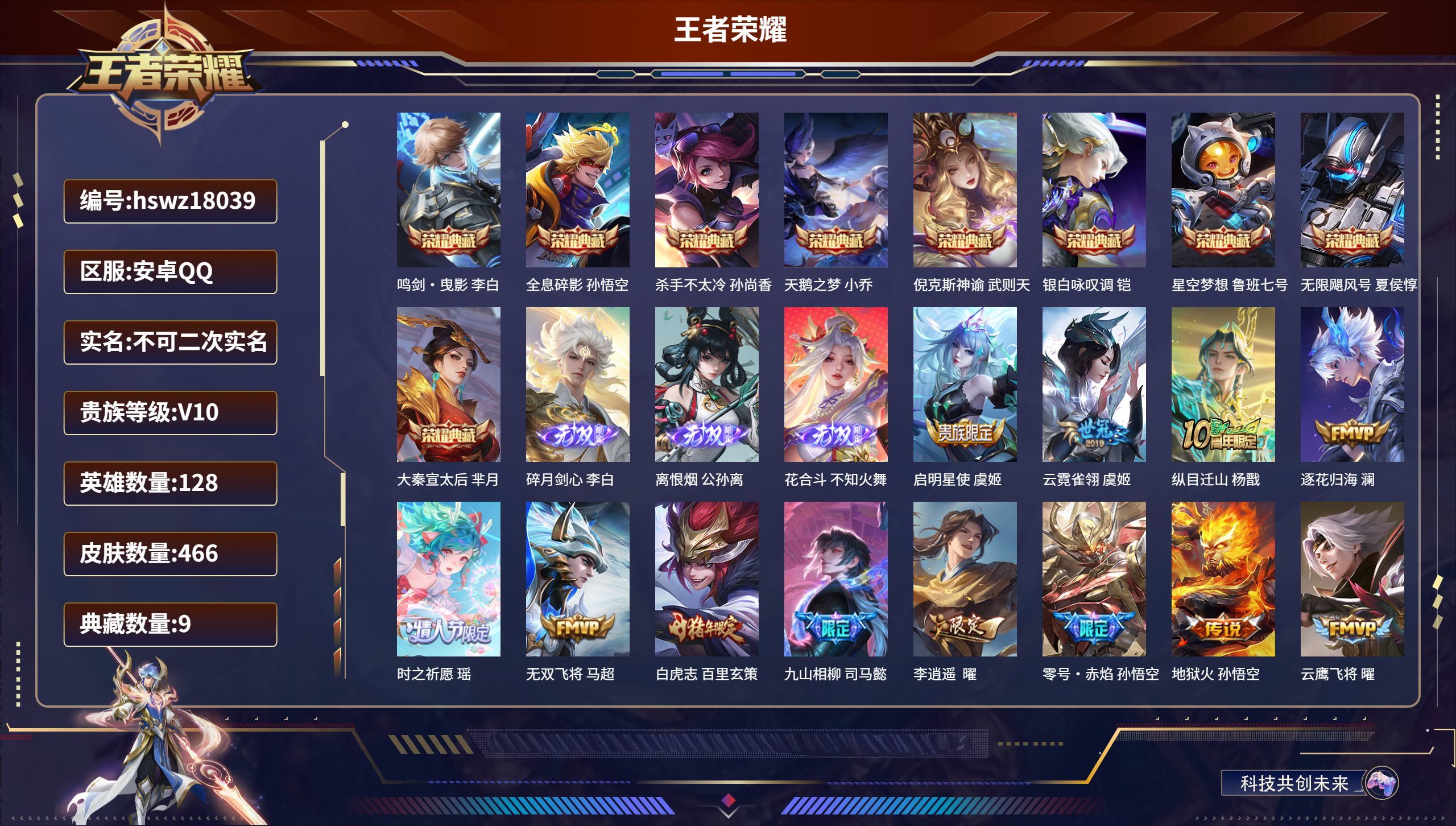 安卓QQ/传奇王者/466皮肤/128英雄/9典藏/0珍品无双/3无双/0珍品传说/46传说/150