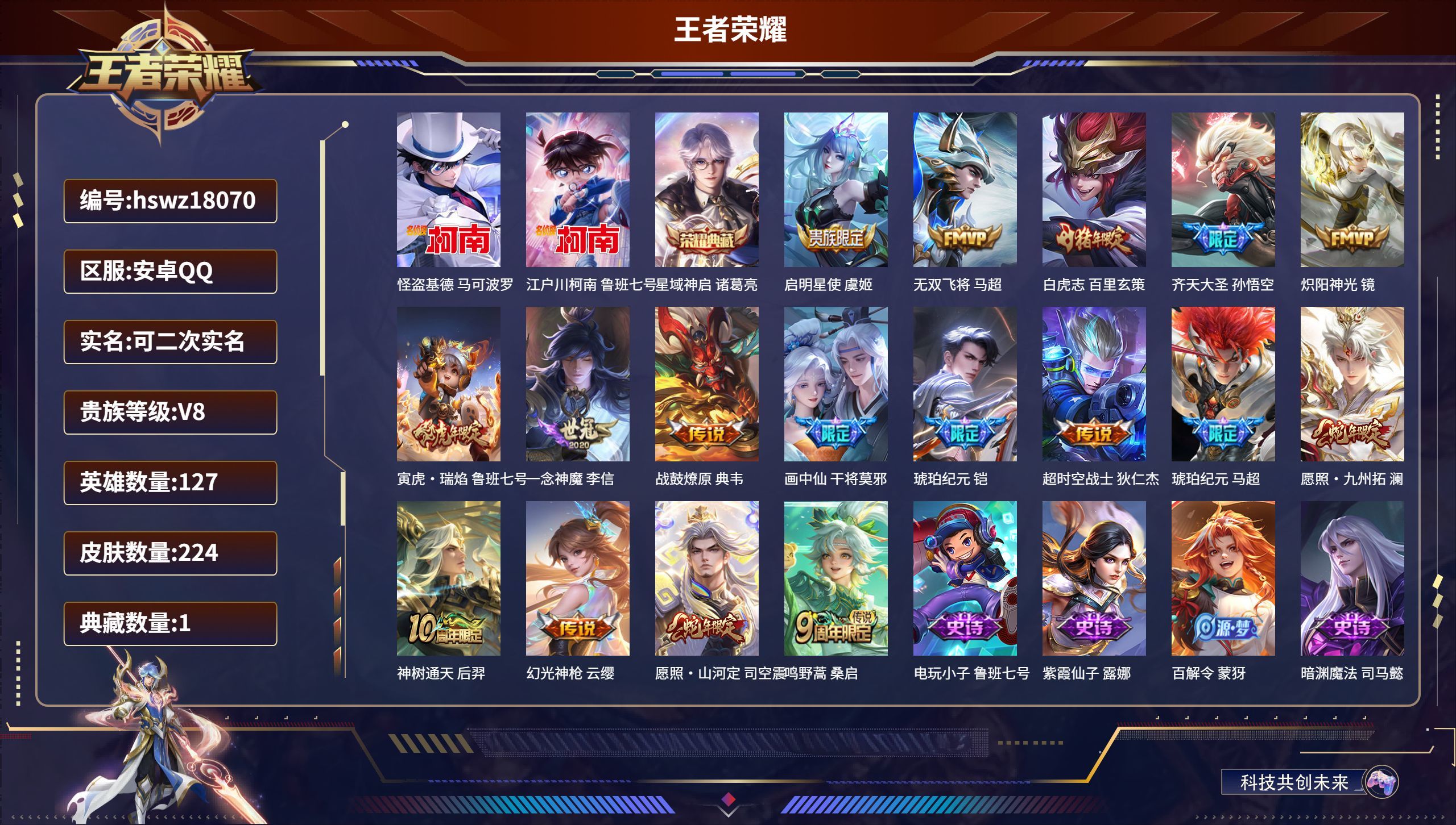 安卓QQ/最强王者/224皮肤/127英雄/1典藏/0珍品无双/0无双/2珍品传说/17传说/64史
