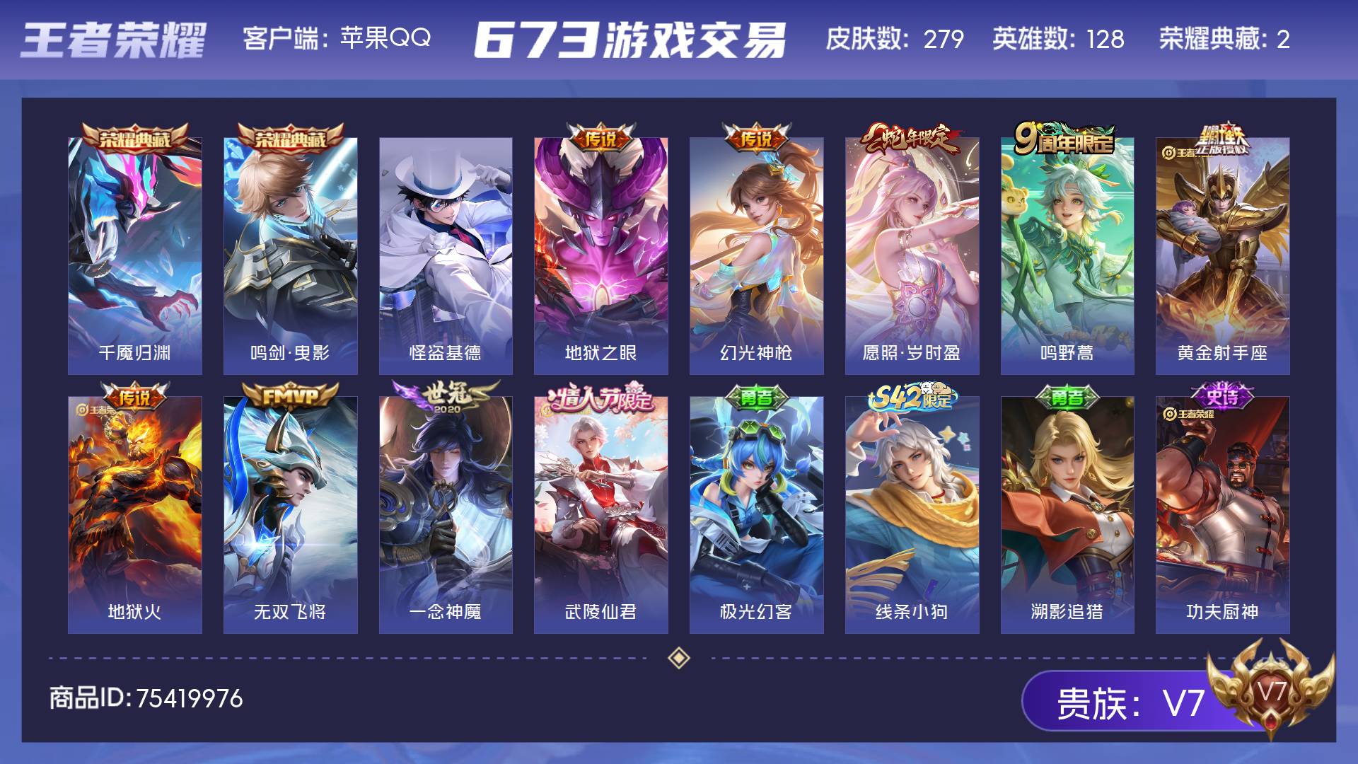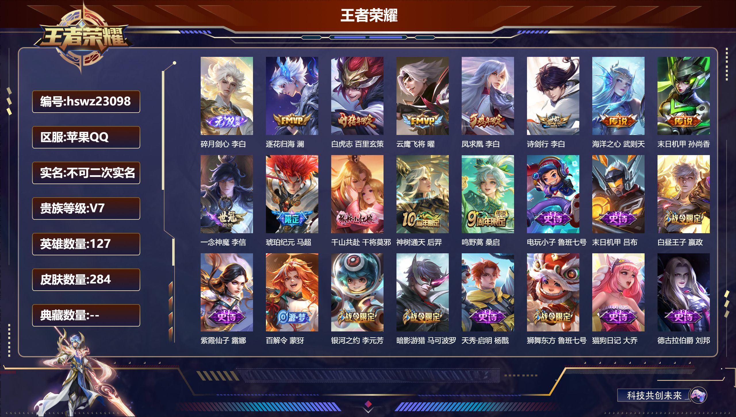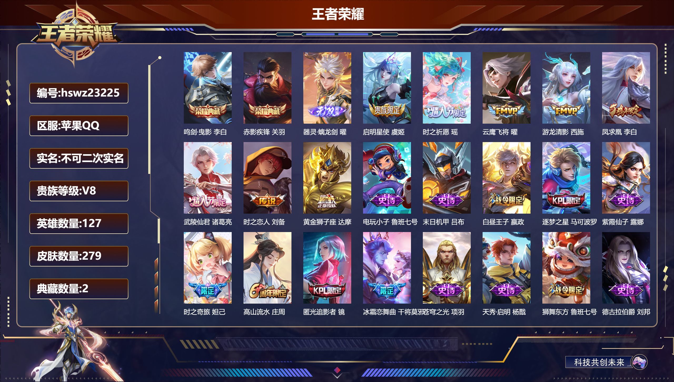 苹果QQ/至尊星耀/279皮肤/127英雄/2典藏/0珍品无双/1无双/0珍品传说/8传说/87史诗