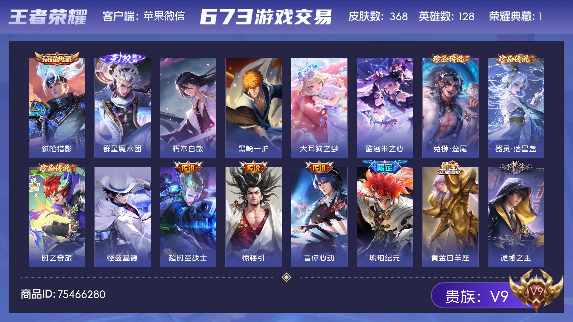 V9 皮肤368 英雄128 荣耀王者 荣耀典藏1 无双皮肤1 珍品传说8 星传说3 传说40 其他皮肤321
