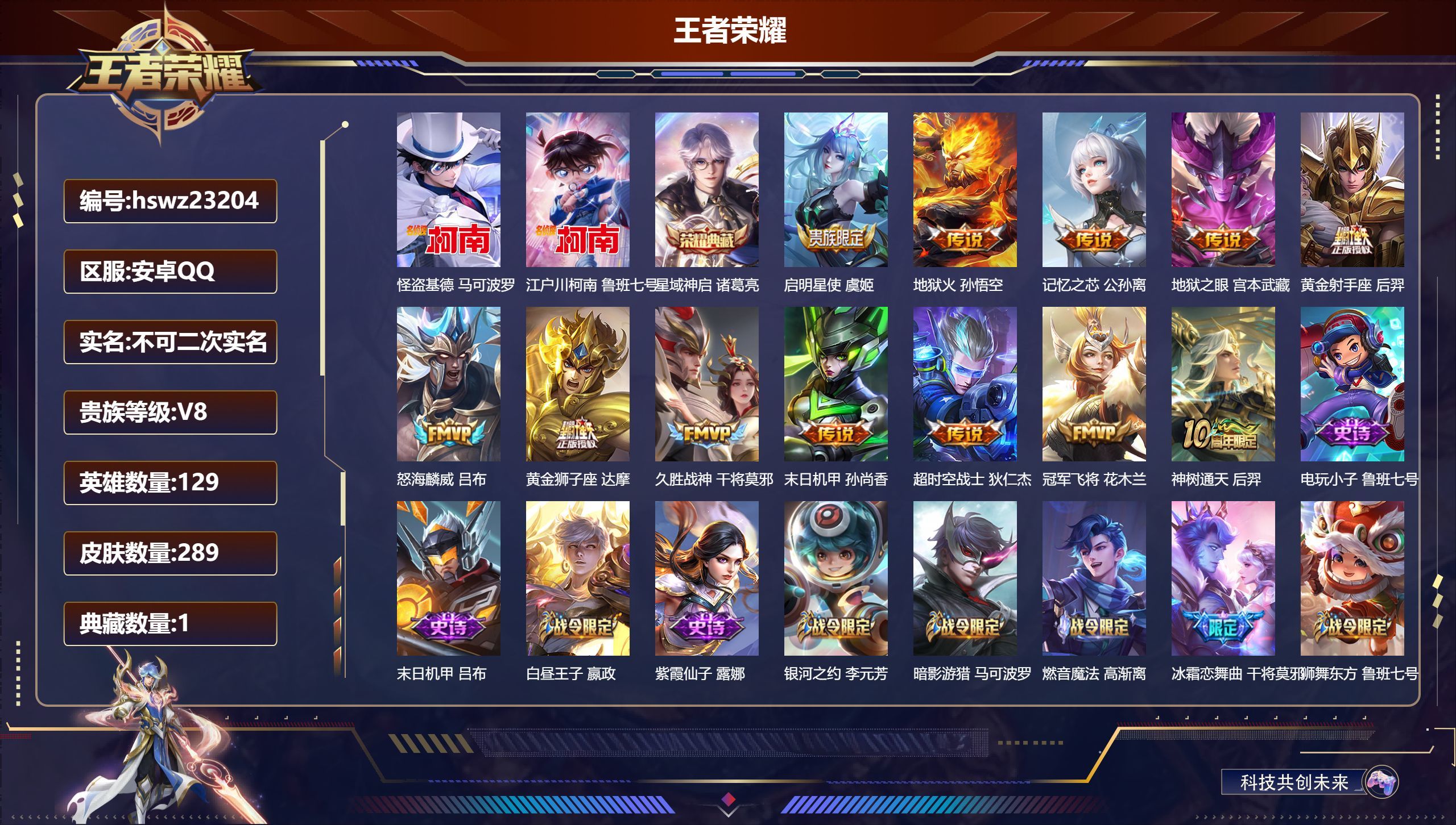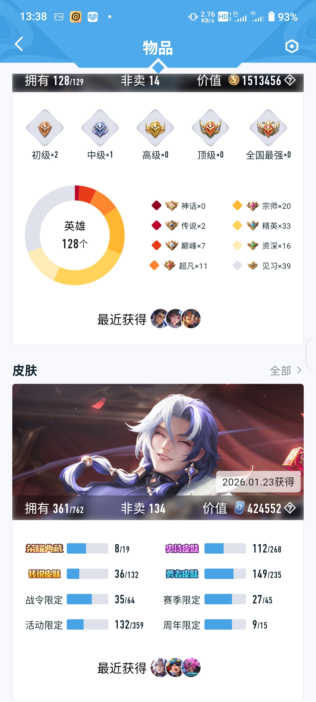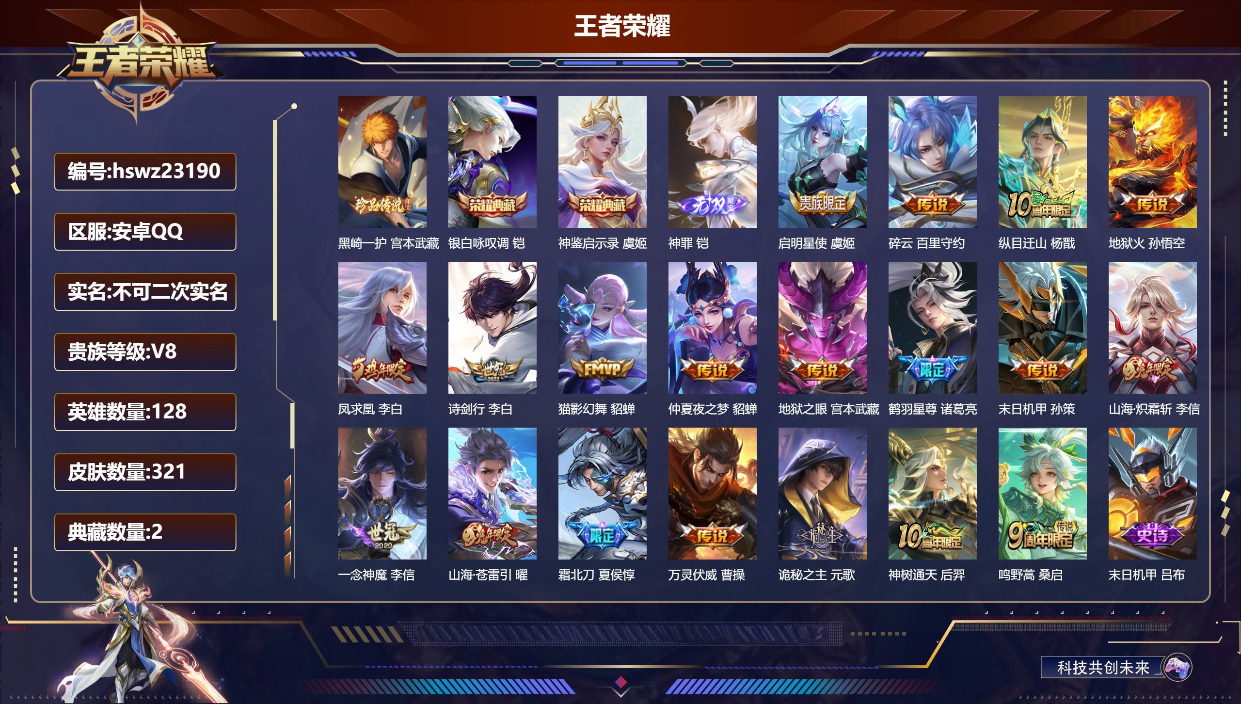 安卓QQ/至尊星耀/321皮肤/128英雄/2典藏/0珍品无双/1无双/1珍品传说/19传说/79史