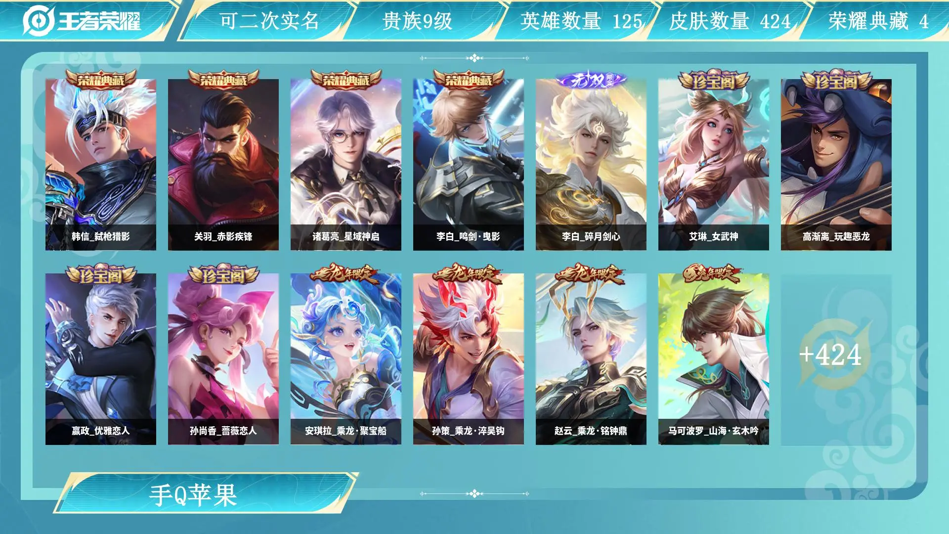 苹果QQ/最强王者/284皮肤/127英雄/0典藏/0珍品无双/1无双/0珍品传说/12传说/84史