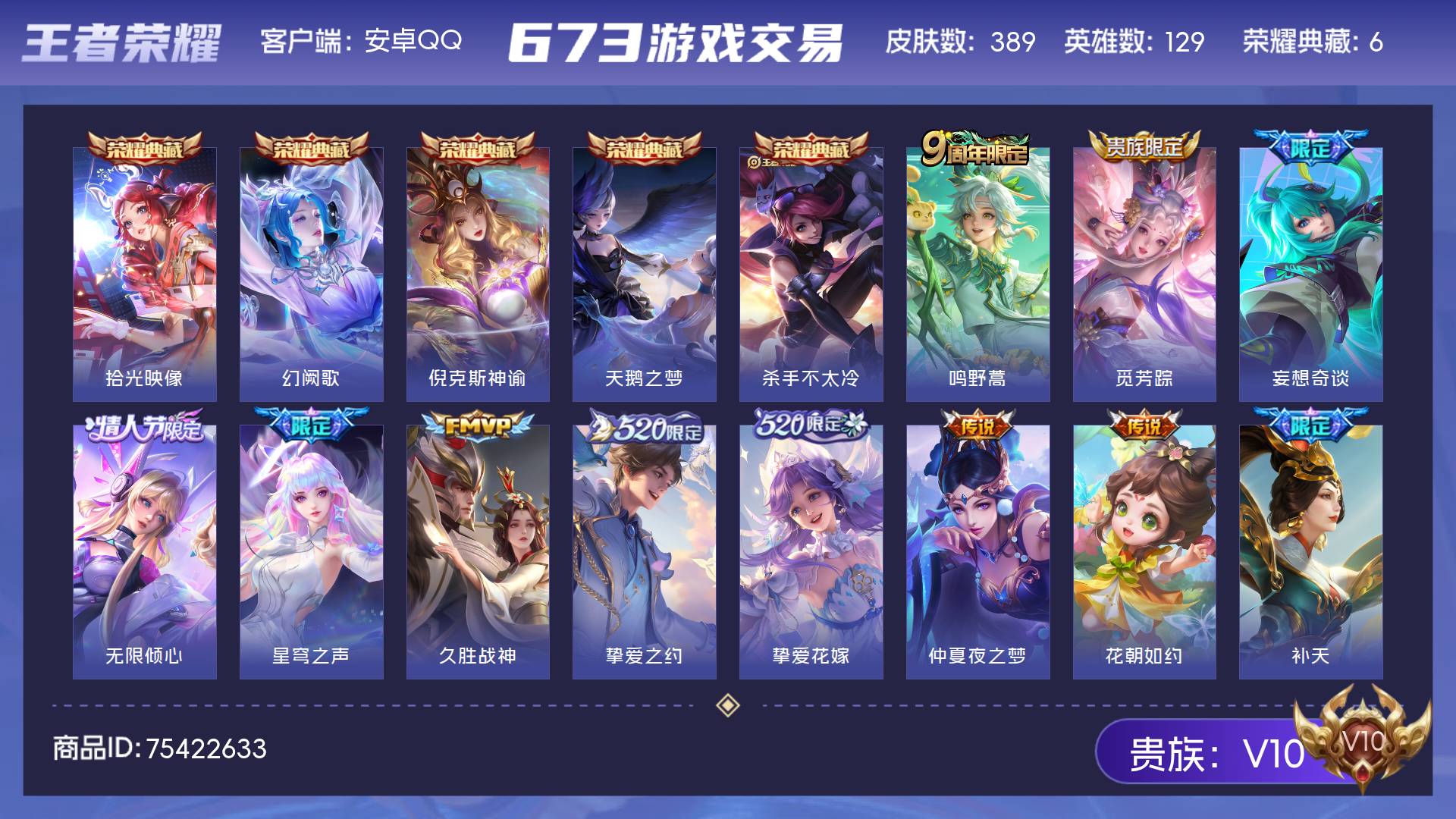 V10 皮肤389 英雄129 至尊星耀 荣耀典藏6 传说27 其他皮肤362