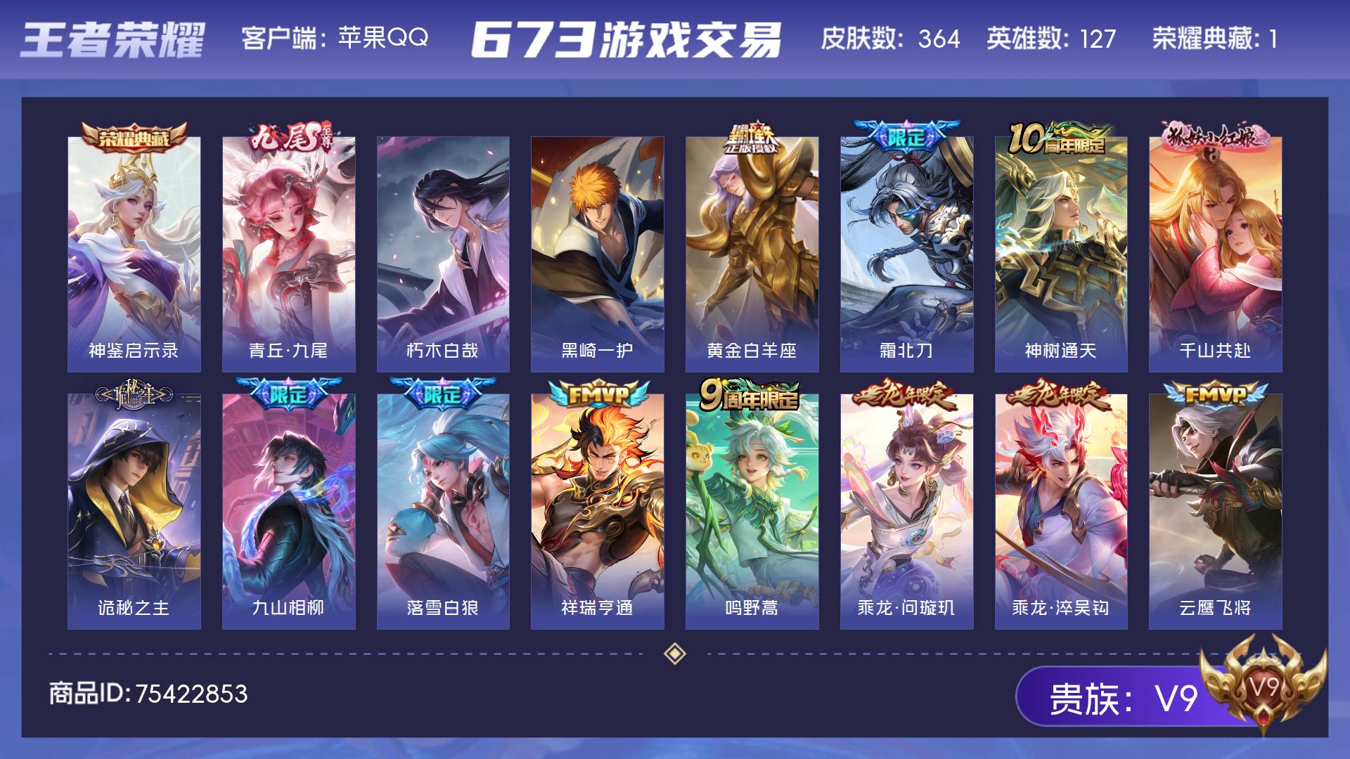V9 皮肤364 英雄127 至尊星耀 荣耀典藏1 无双皮肤1 珍品传说2 星传说2 传说34 其他皮肤328