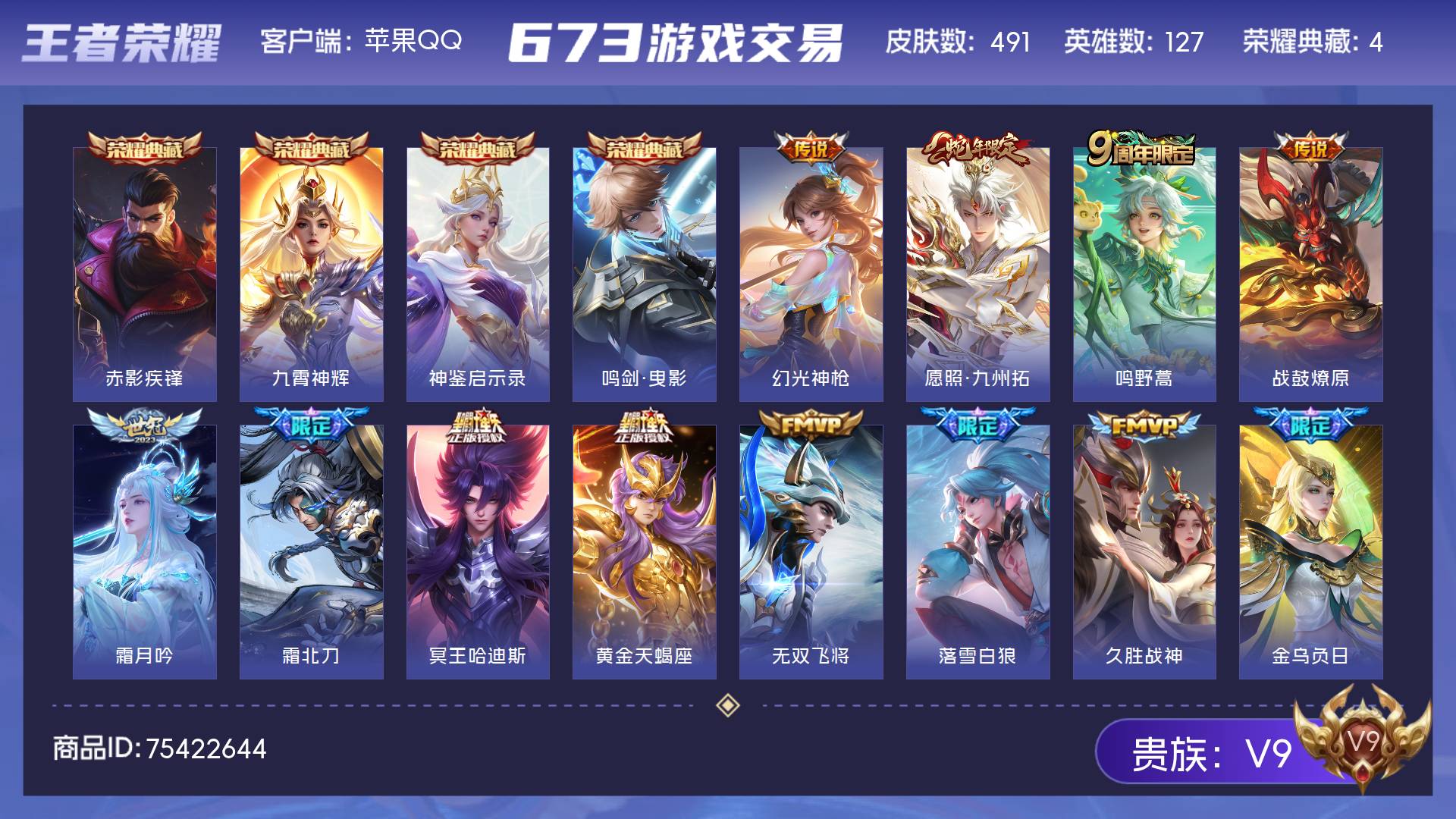 V9 皮肤491 英雄127 无双王者 荣耀典藏4 传说46 其他皮肤445