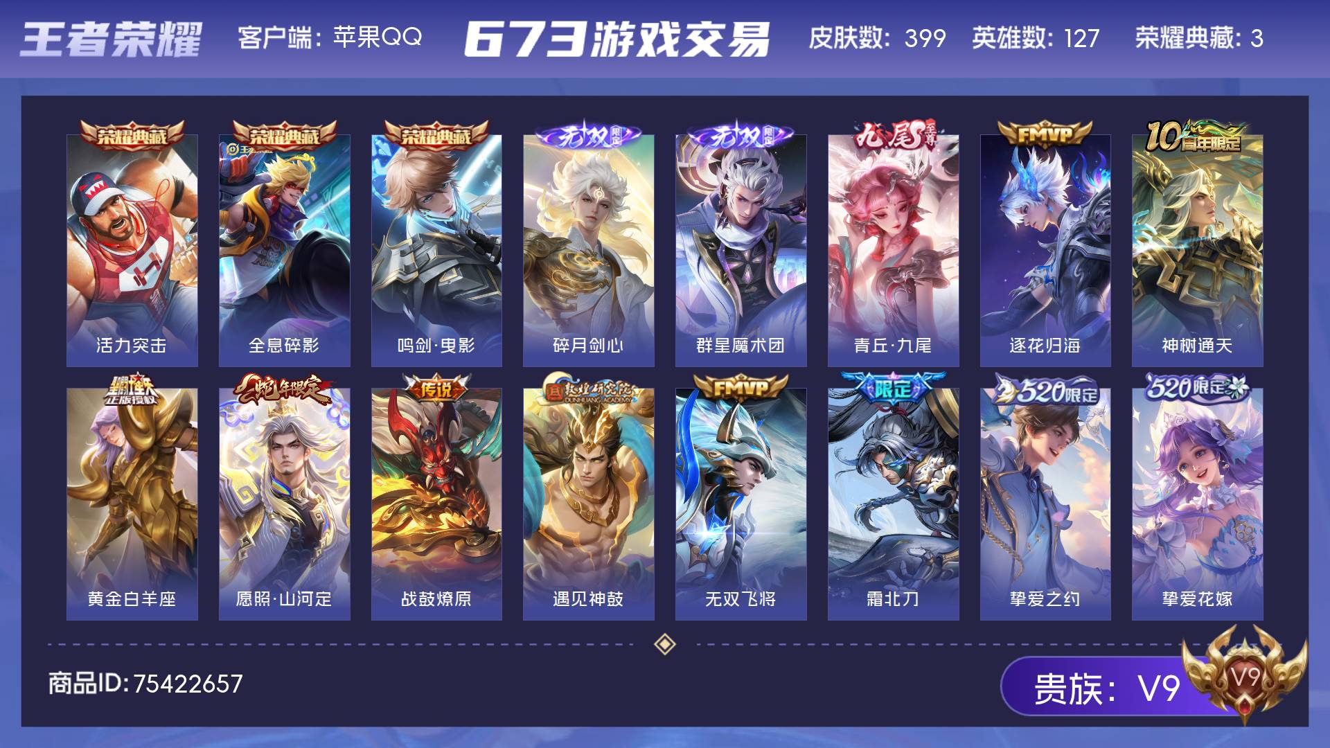 V9 皮肤399 英雄127 永恒钻石 荣耀典藏3 无双皮肤3 传说46 其他皮肤352