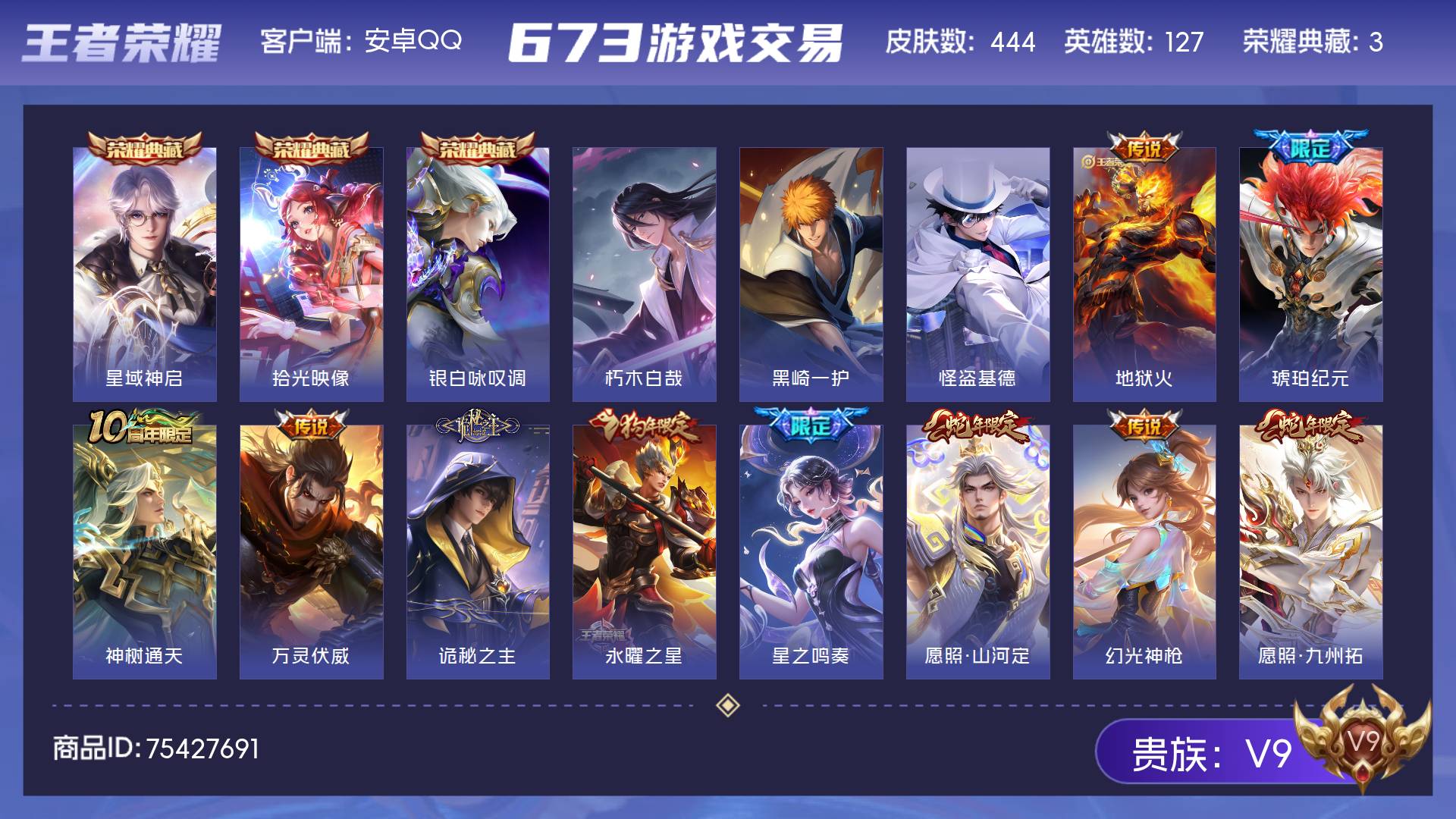 V9 皮肤444 英雄127 至尊星耀 荣耀典藏3 珍品传说3 传说44 其他皮肤397