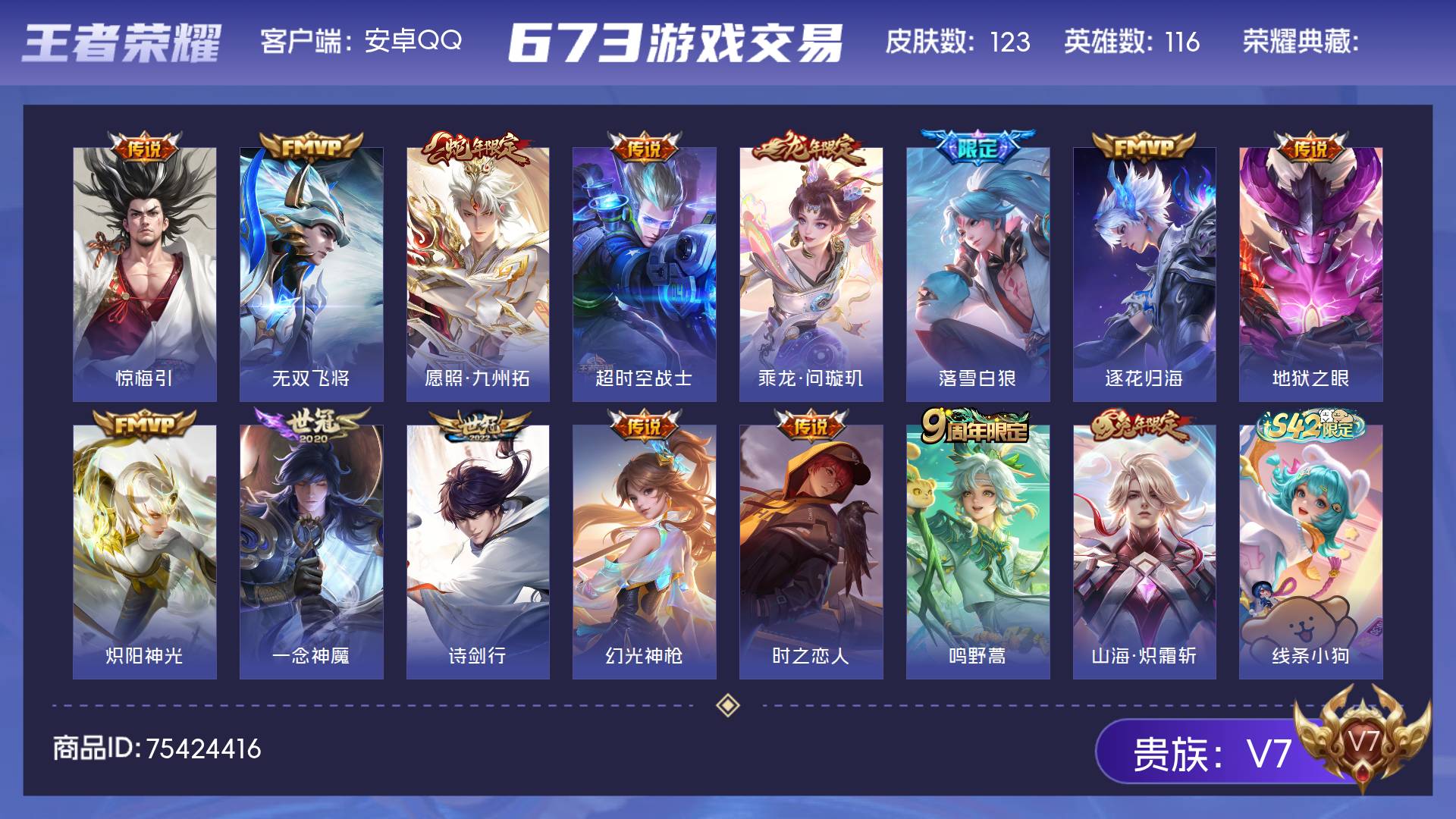 V7 皮肤123 英雄116 至尊星耀 传说15 其他皮肤113
