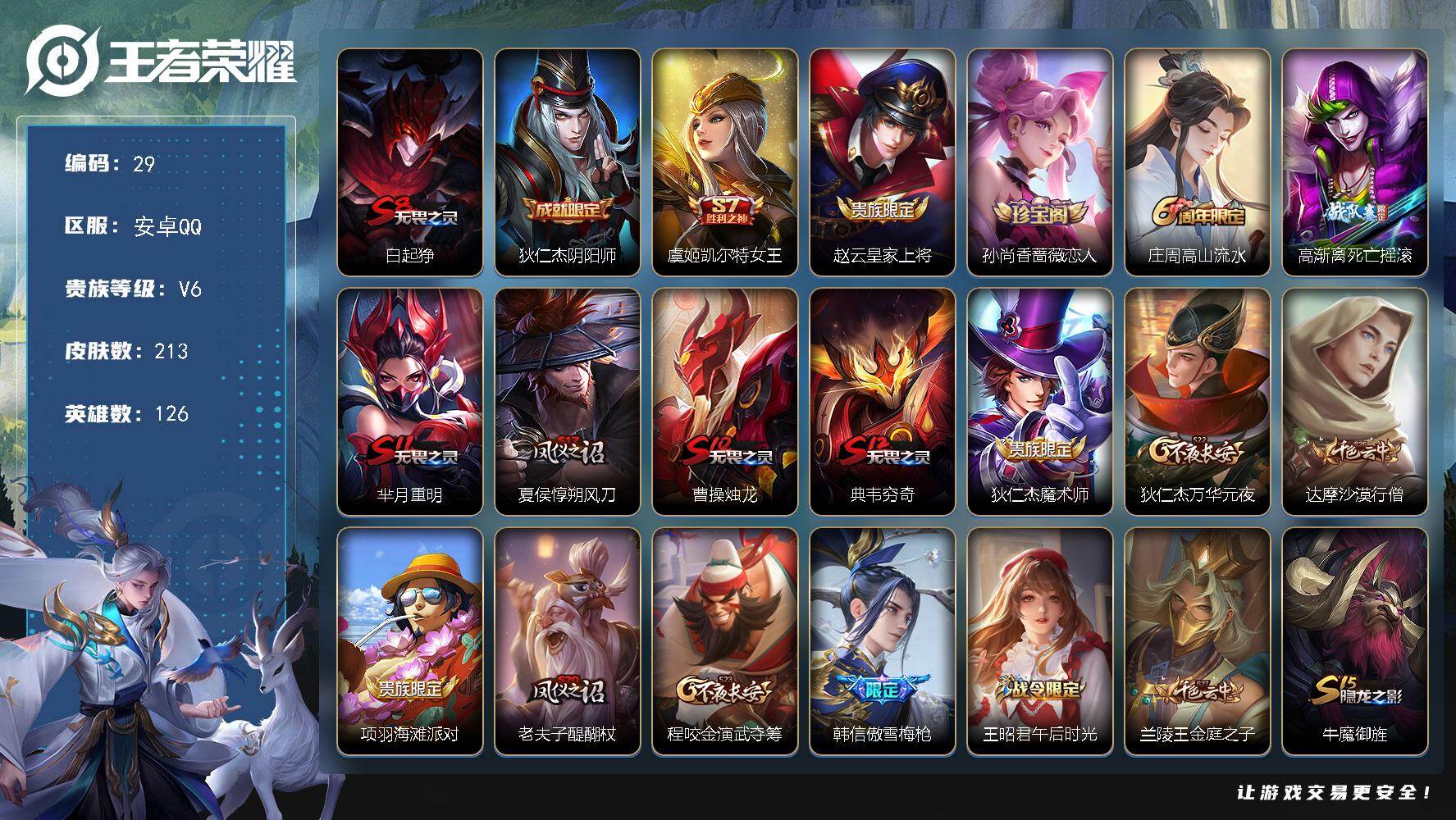 安卓Q-V6-至尊星耀IV段位-126英雄-213皮肤-40史诗【限定皮肤】