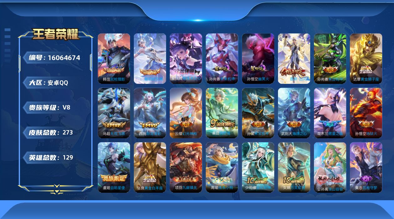 V9 皮肤409 英雄129 最强王者 荣耀典藏3 无双皮肤1 珍品传说3 传说30 其他皮肤376