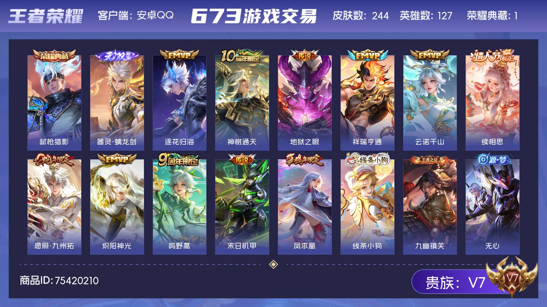 V7 皮肤244 英雄127 至尊星耀 荣耀典藏1 无双皮肤1 传说11 其他皮肤235