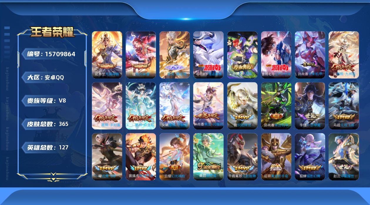 V7 皮肤158 英雄127 至尊星耀 荣耀典藏1 传说8 其他皮肤153