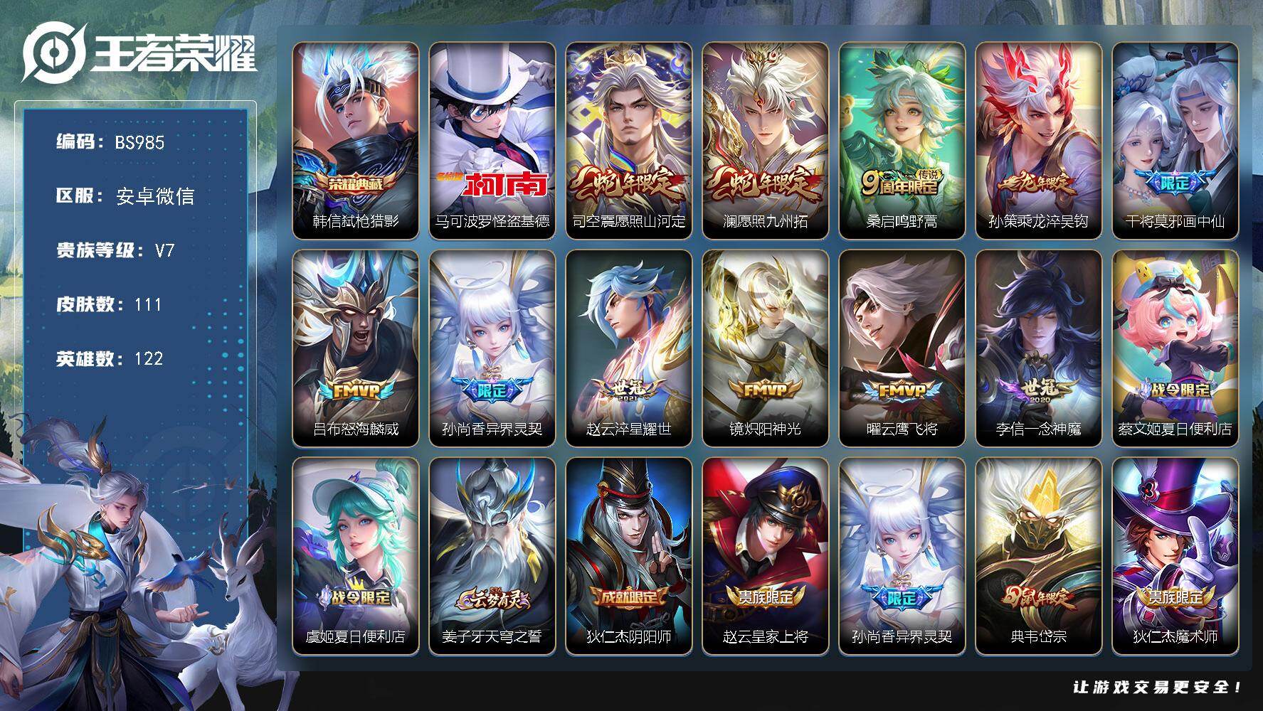 安卓WX-V7-永恒钻石II段位-126英雄-218皮肤-1典藏皮肤-1珍品传