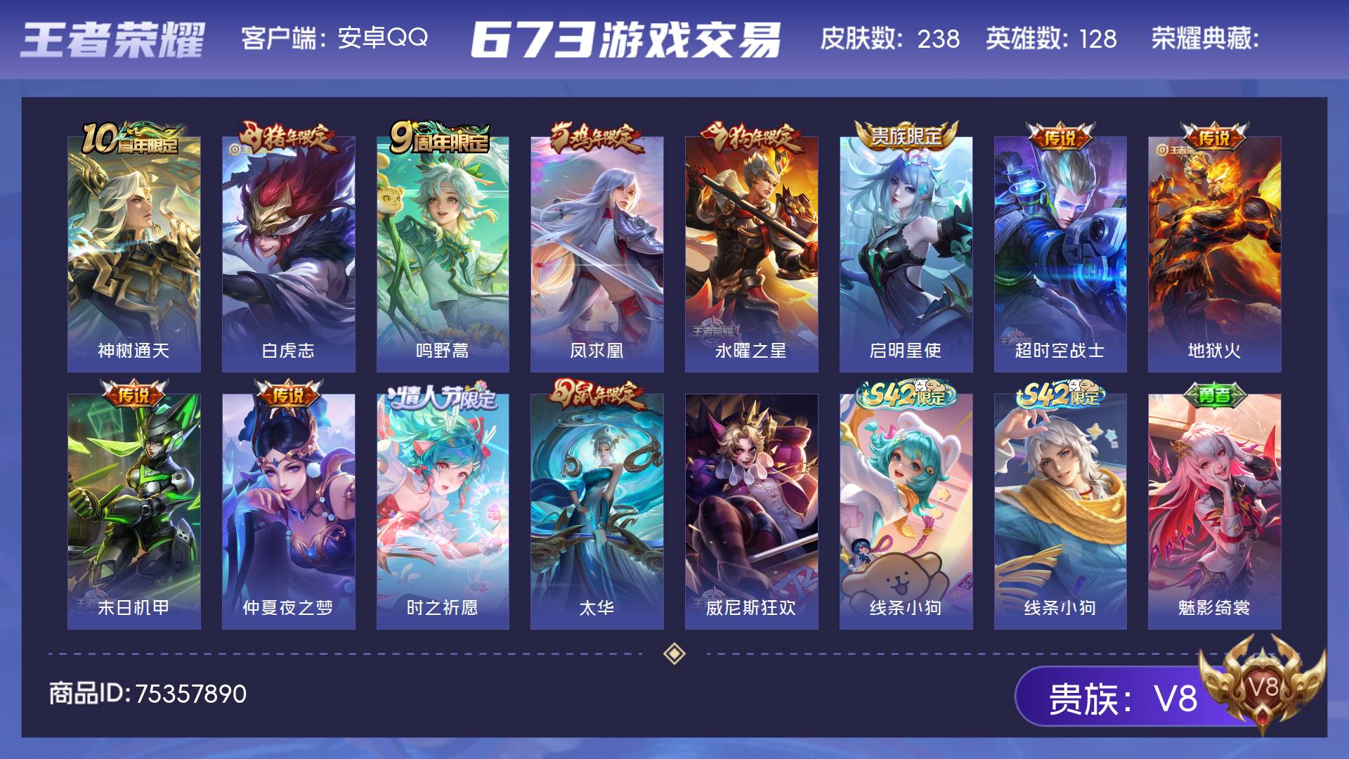 V8 皮肤238 英雄128 最强王者 传说12 其他皮肤232