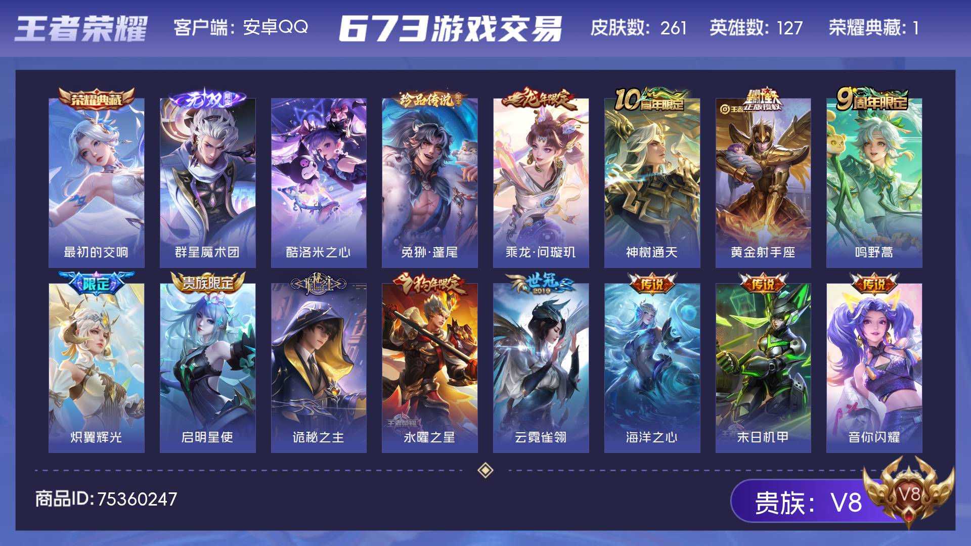V8 皮肤261 英雄127 最强王者 荣耀典藏1 无双皮肤1 珍品传说2 传说18 其他皮肤243