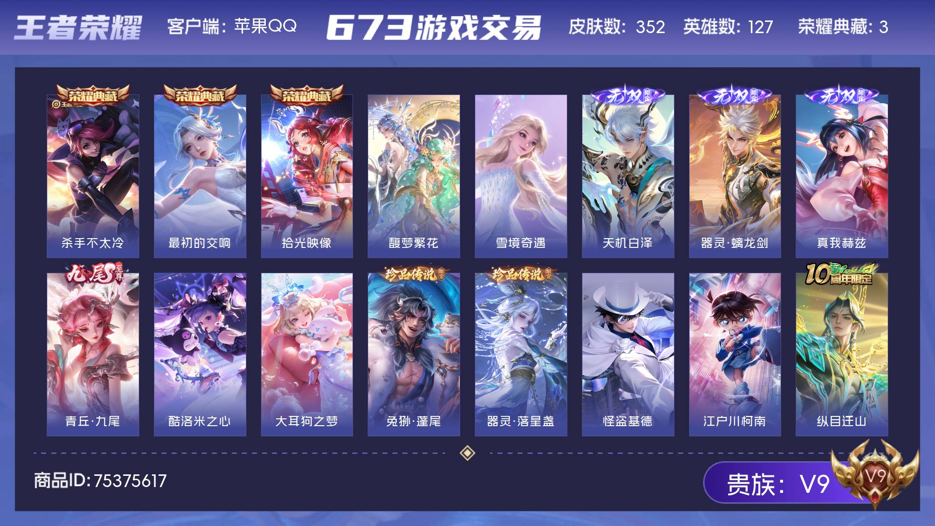 V9 皮肤352 英雄127 最强王者 荣耀典藏3 珍品无双1 无双皮肤5 珍品传说6 传说31 其他皮肤310
