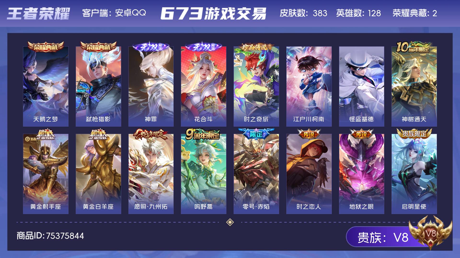 V8 皮肤383 英雄128 至尊星耀 荣耀典藏2 无双皮肤2 珍品传说3 传说21 其他皮肤361