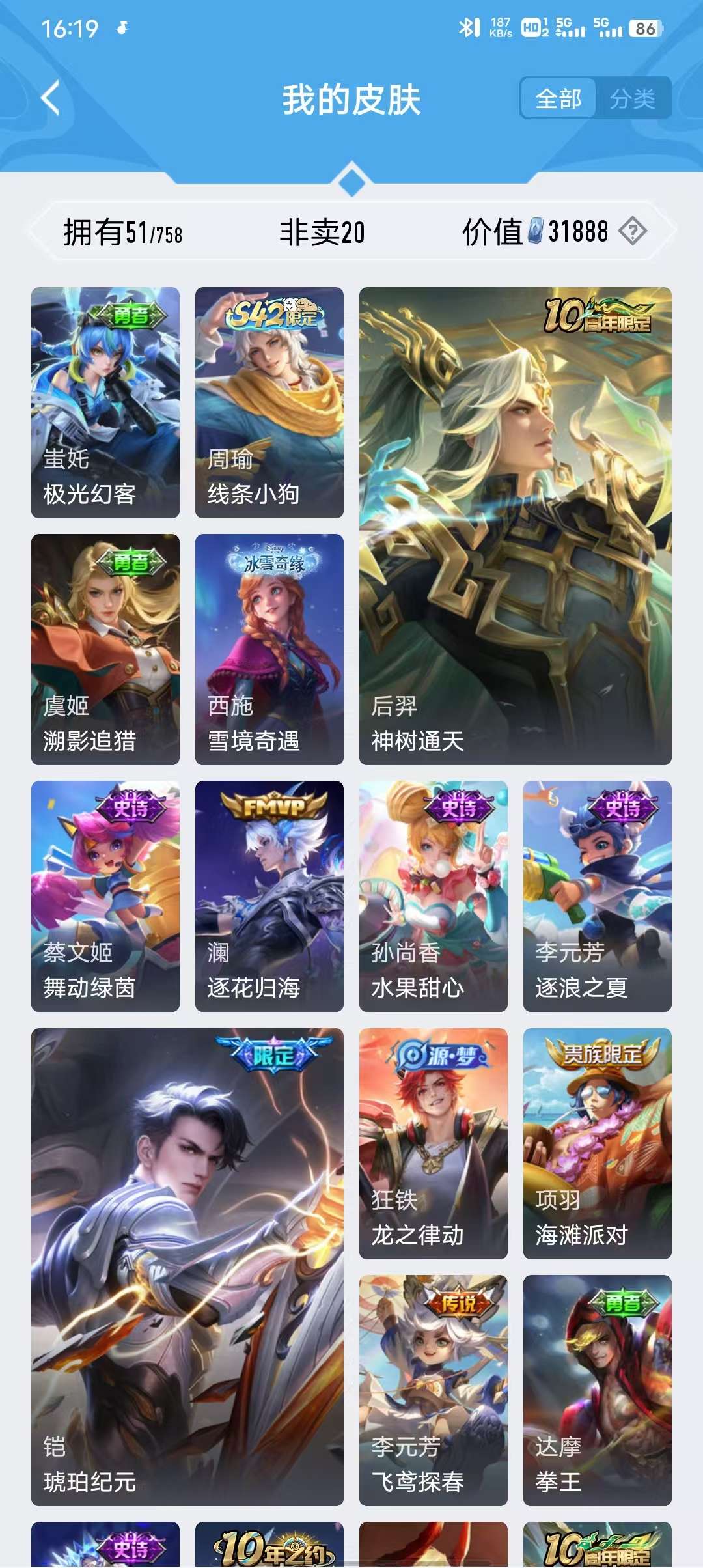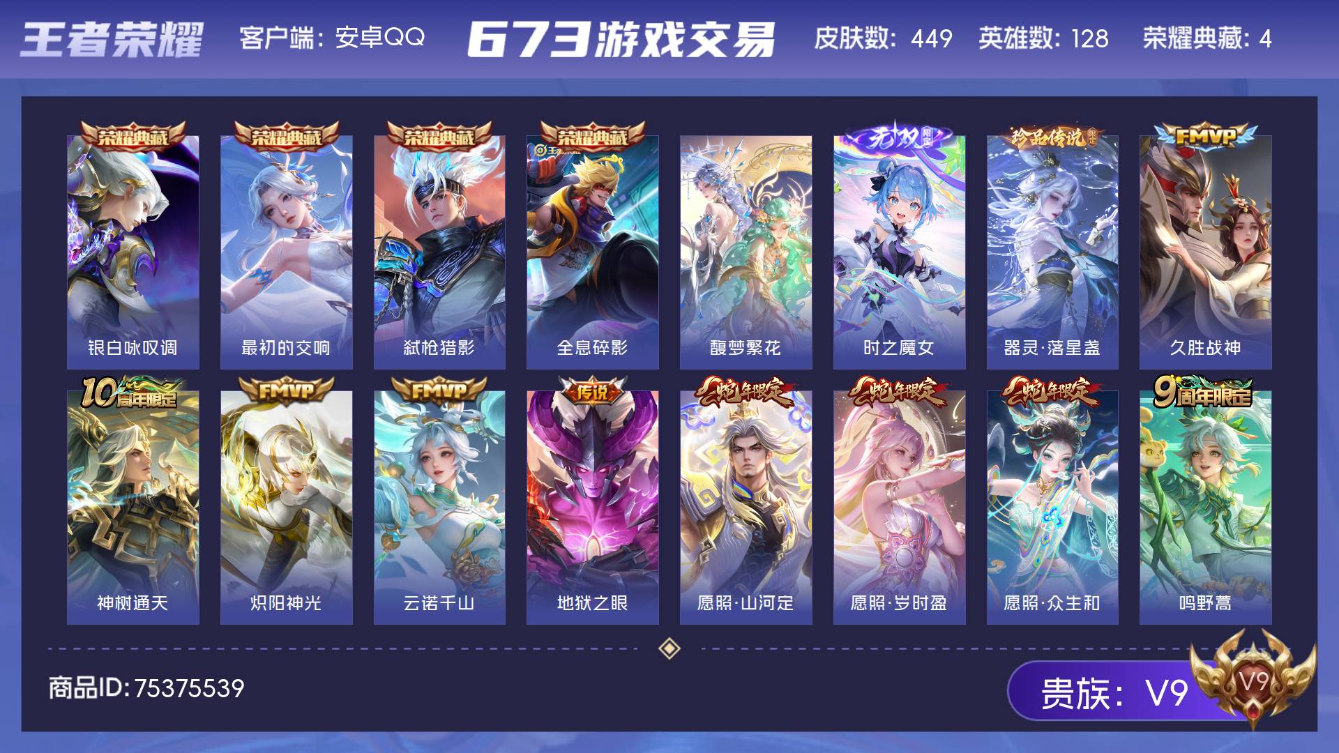 V9 皮肤449 英雄128 尊贵铂金 荣耀典藏4 珍品无双1 无双皮肤1 珍品传说1 传说27 其他皮肤419