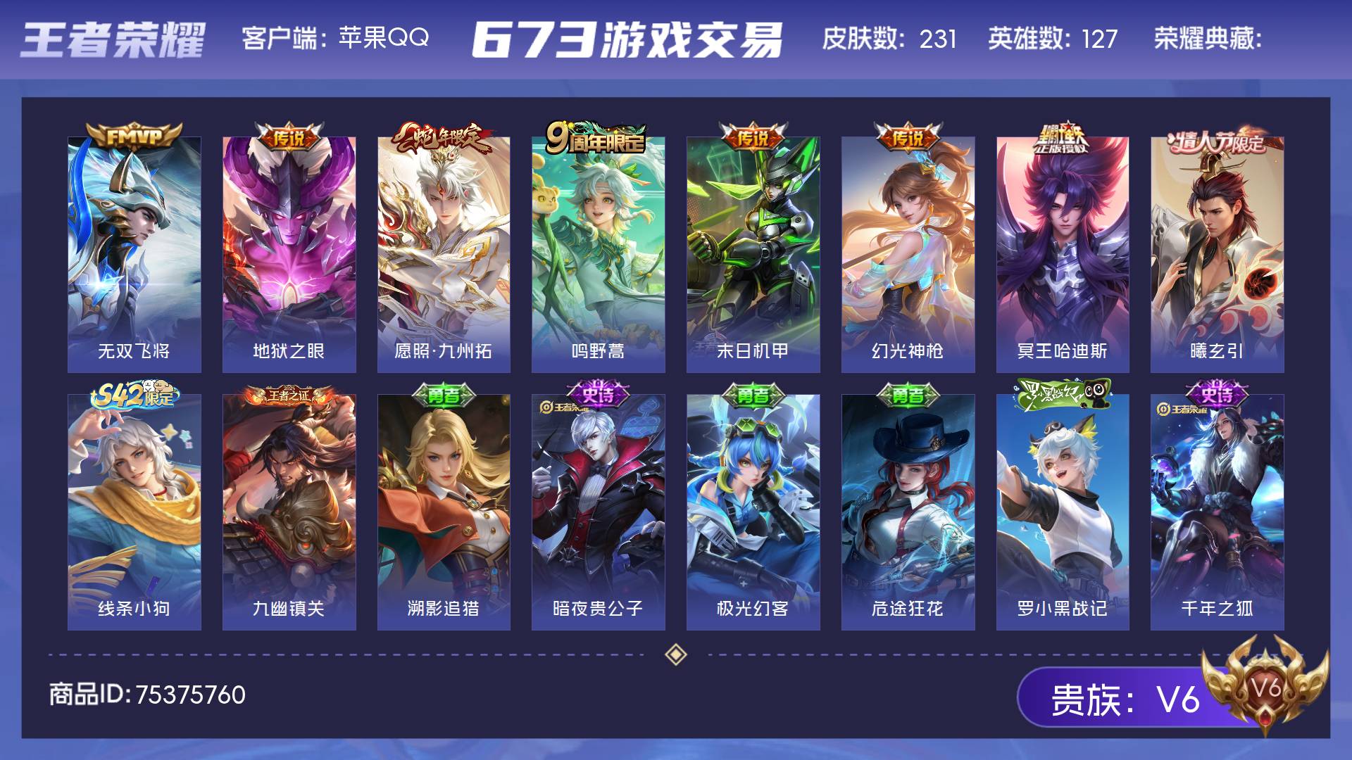 V6 皮肤231 英雄127 至尊星耀 传说8 其他皮肤227