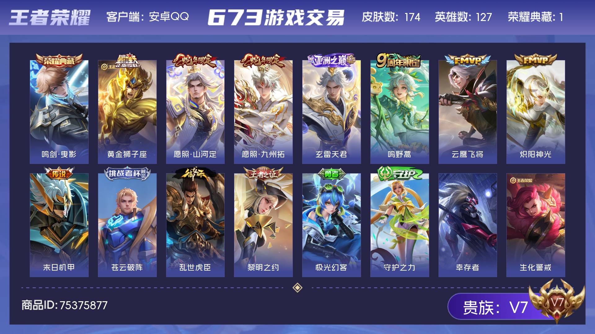 V7 皮肤174 英雄127 永恒钻石 荣耀典藏1 传说8 其他皮肤171
